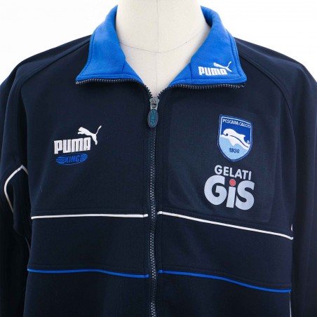 La giacca vintage Pescara è prodotta dallo sponsor Puma per la stagione 1997/1998. La giacca non discontinuità di colore e i loghi sono in buone condizioni. La zip frontale ha riporta la scritta King. Sul retro sono presenti i loghi di sponsor tecnico e commerciale Puma e Gelati Gis.