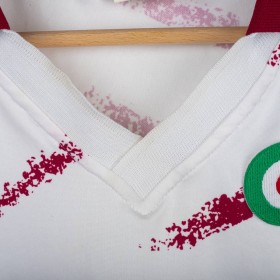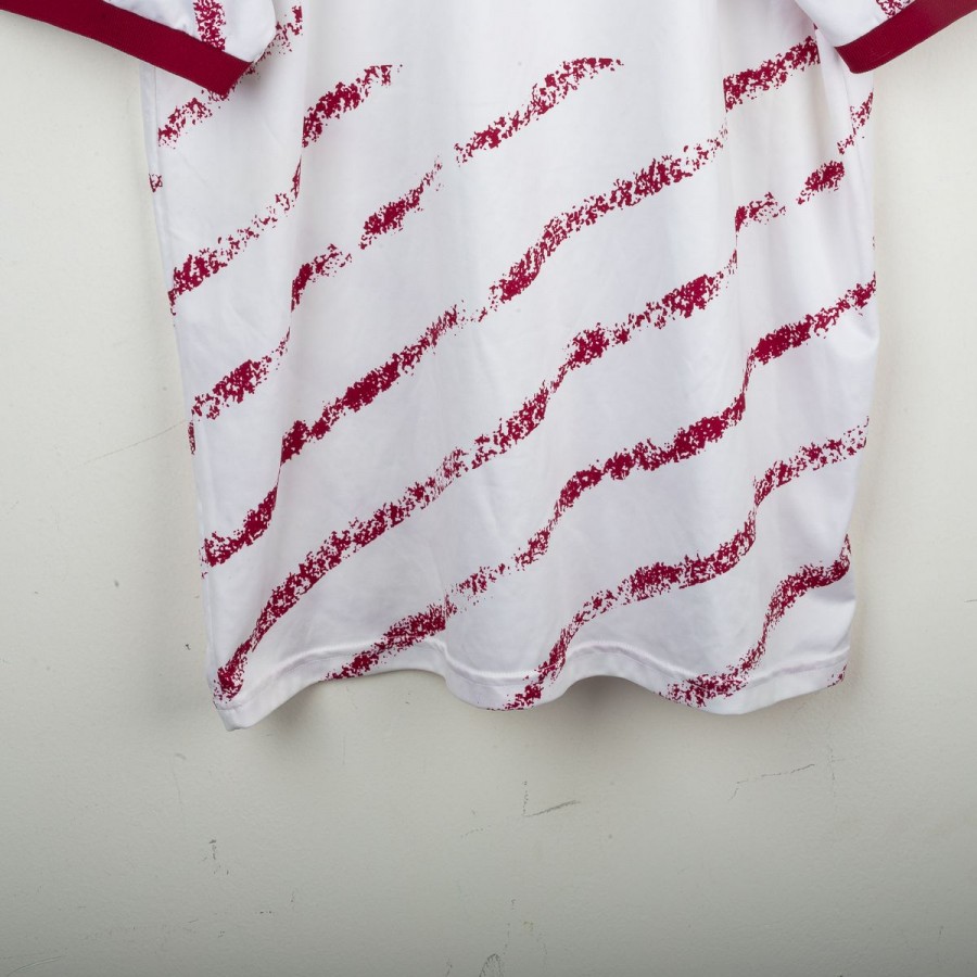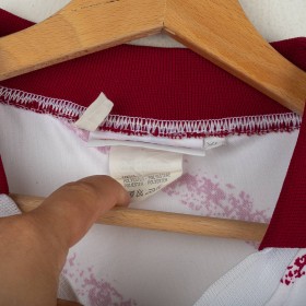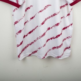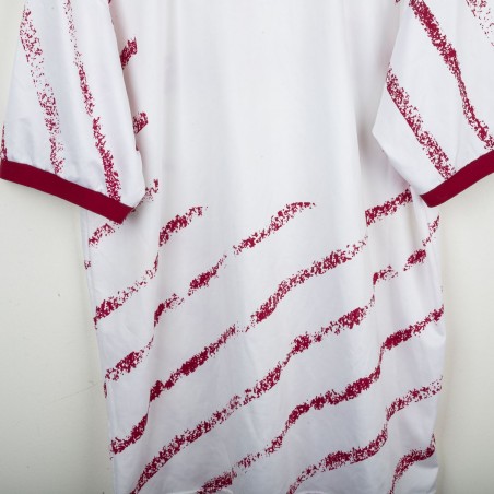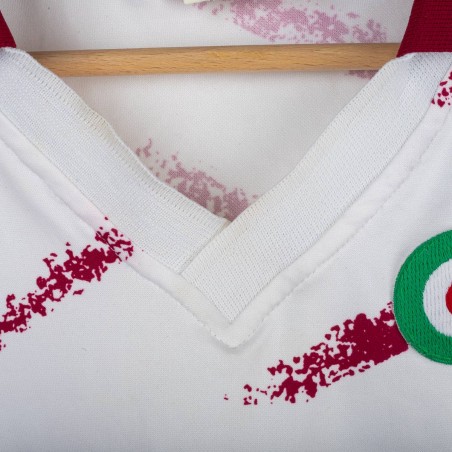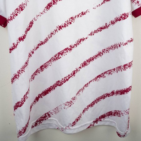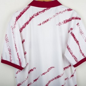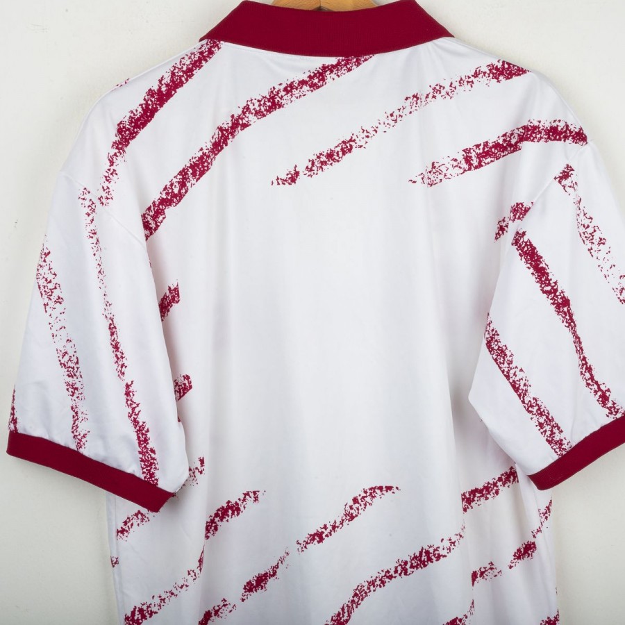 Maglia ufficiale away del Torino FC prodotta da Lotto per la stagione 1993/1994. Design bianco con grafiche diagonali granata effetto pennellata, colletto e bordi maniche in contrasto granata. Logo Lotto ricamato sul petto destro e stemma storico del Torino cucito lato cuore, accompagnato dal tricolore che celebra la Coppa Italia 1992/1993. Sponsor “Beretta” stampato al centro. Tessuto tecnico leggero e traspirante in poliestere. Maglia originale Lotto d'epoca, simbolo di un periodo iconico della squadra granata negli anni '90. Taglia XL.