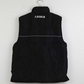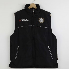 Gilet ufficiale Udinese realizzato da Legea per la stagione 2010/2011. Colore nero con dettagli bianchi a contrasto e zip centrale. Sul petto destro logo Legea ricamato in bianco e rosso, mentre sul lato cuore è cucito lo stemma Udinese Calcio con la storica corona d'alloro dorata. Logo Legea ricamato anche sul retro. Tasche laterali con zip. Taglia M. Capo originale Legea, utilizzato nello staff tecnico e da collezione per i tifosi friulani.