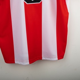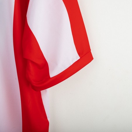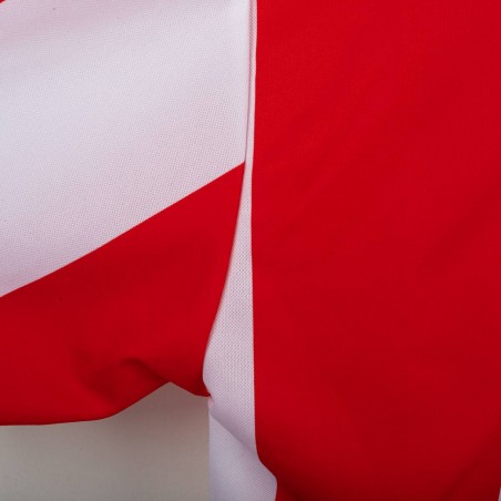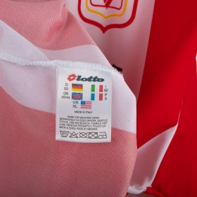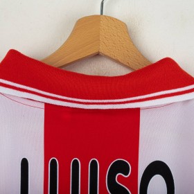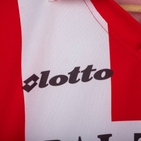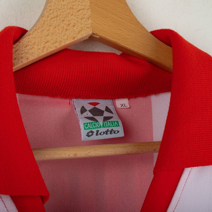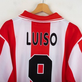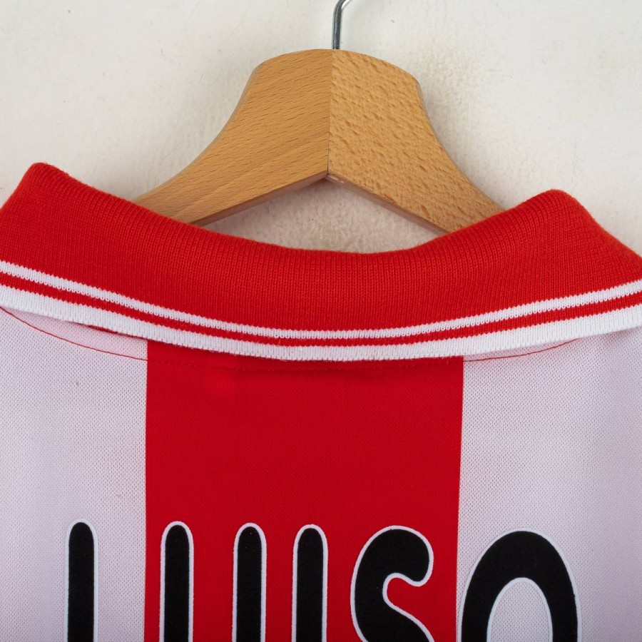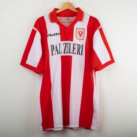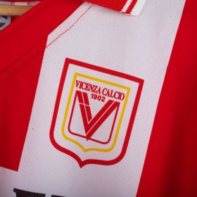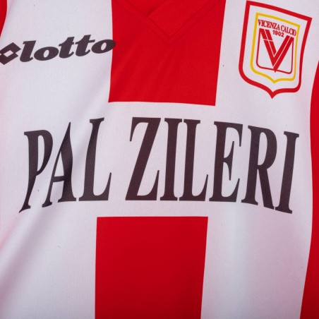 Maglia ufficiale home del Vicenza prodotta da Lotto per la stagione 1997/1998, con personalizzazione Pasquale Luiso numero 9. Design a strisce verticali bianche e rosse con colletto polo rosso e dettagli bianchi. Stemma Vicenza Calcio ricamato lato cuore e logo Lotto applicato lato destro. Sponsor frontale Pal Zileri in nero. Tessuto tecnico traspirante, tipico delle produzioni Lotto di fine anni '90. Maglia storica, indossata in una delle stagioni più importanti del club, con Luiso protagonista in Coppa delle Coppe.