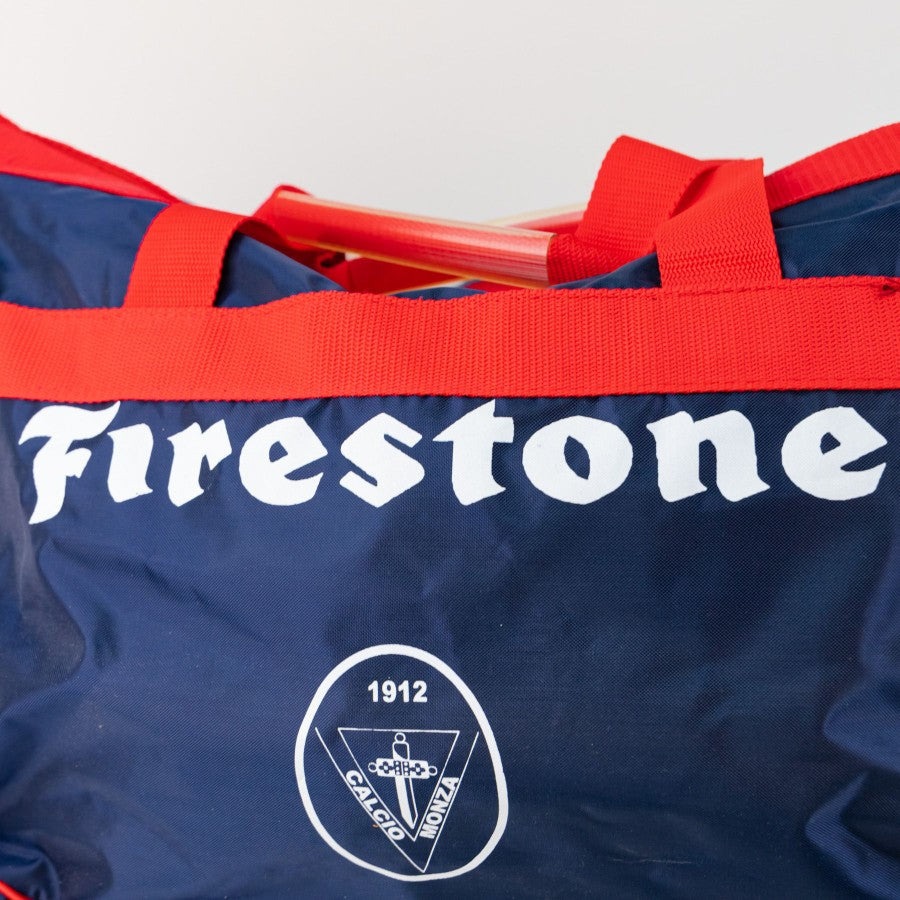 Logo Calcio Monza. Sponsor commerciale Firestone e logo Reebok impresso sul portascarpe