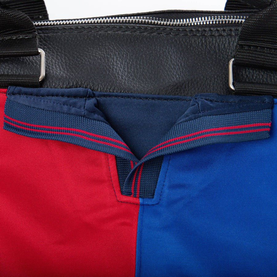 Borsone del Barcellona prodotto da Nike nella stagione 1999/2000. La particolarità del borsone sta nella parte frontale, dove è riprodotto lo scollo della maglietta da calcio. In ricamo la patch della squadra ed il baffo Nike.