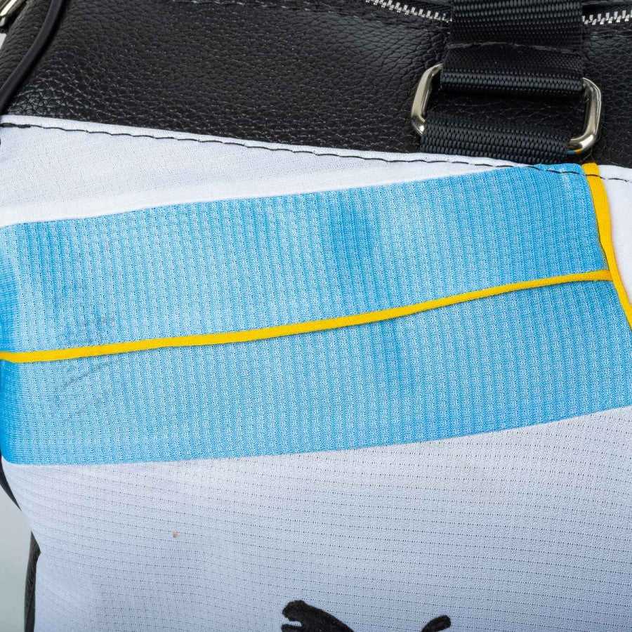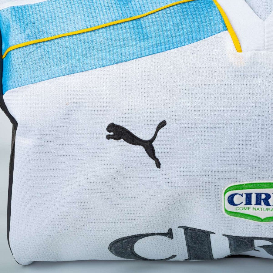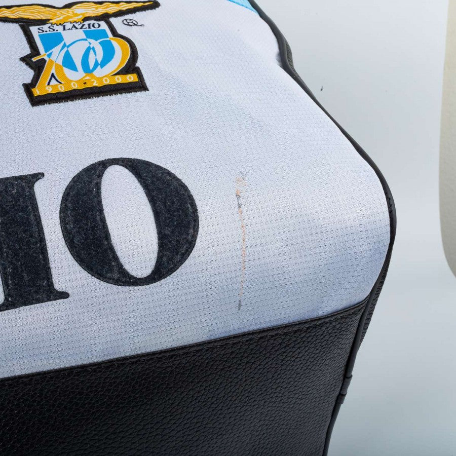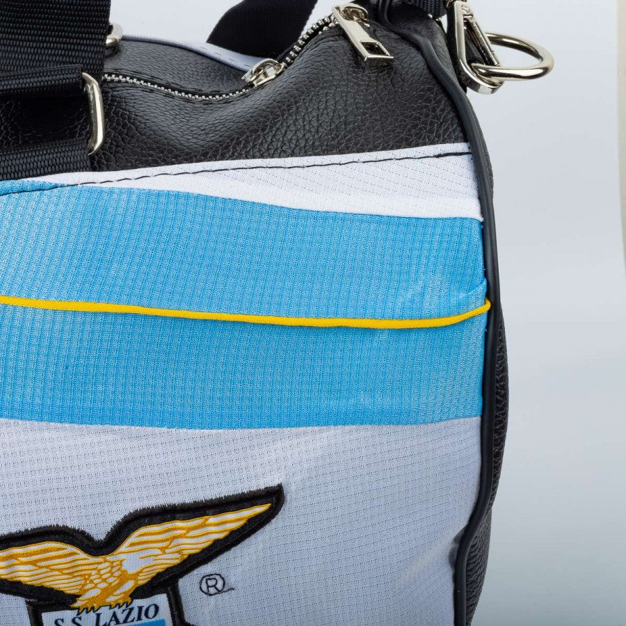 Borsone artigianale realizzato con la maglia originale della Lazio stagione 1999/2000, trasformata in un accessorio unico in simil pelle. Il fronte riprende fedelmente il design della divisa Puma bianca con dettagli celesti e gialli, sponsor Cirio e stemma celebrativo del centenario ricamato. Dotato di manici rinforzati e tracolla regolabile. Schienale in simil pelle nera, interno foderato.