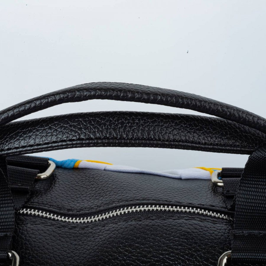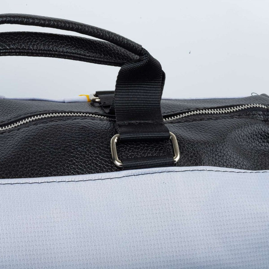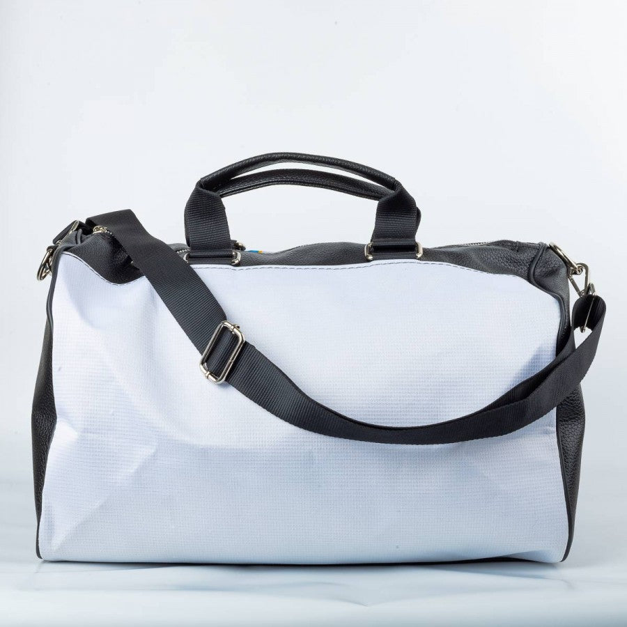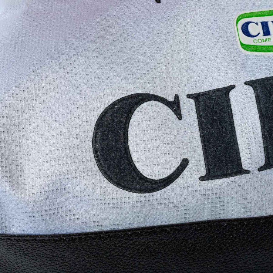Borsone artigianale realizzato con la maglia originale della Lazio stagione 1999/2000, trasformata in un accessorio unico in simil pelle. Il fronte riprende fedelmente il design della divisa Puma bianca con dettagli celesti e gialli, sponsor Cirio e stemma celebrativo del centenario ricamato. Dotato di manici rinforzati e tracolla regolabile. Schienale in simil pelle nera, interno foderato.