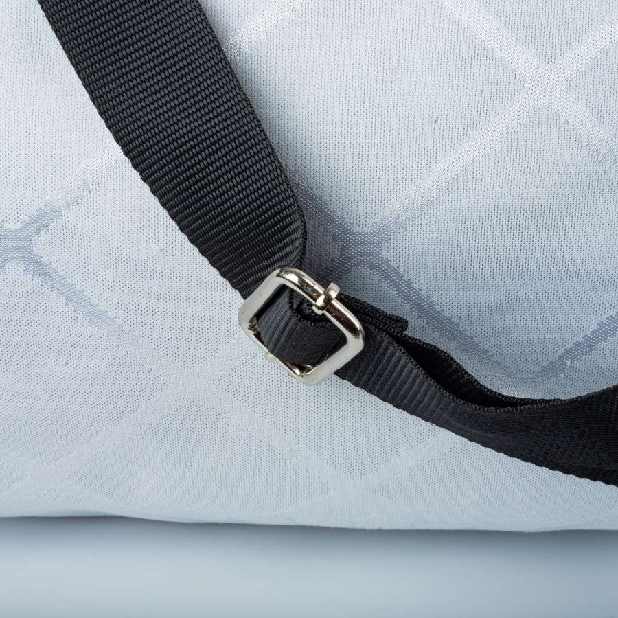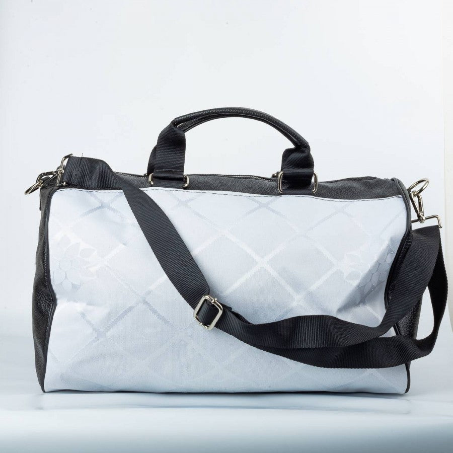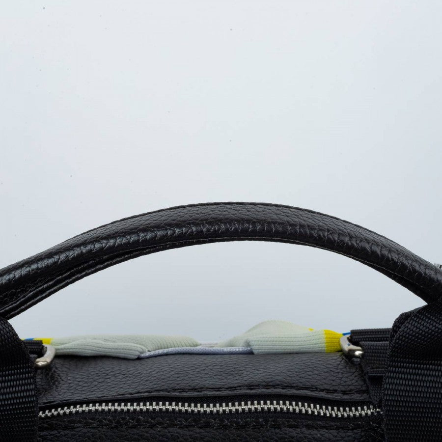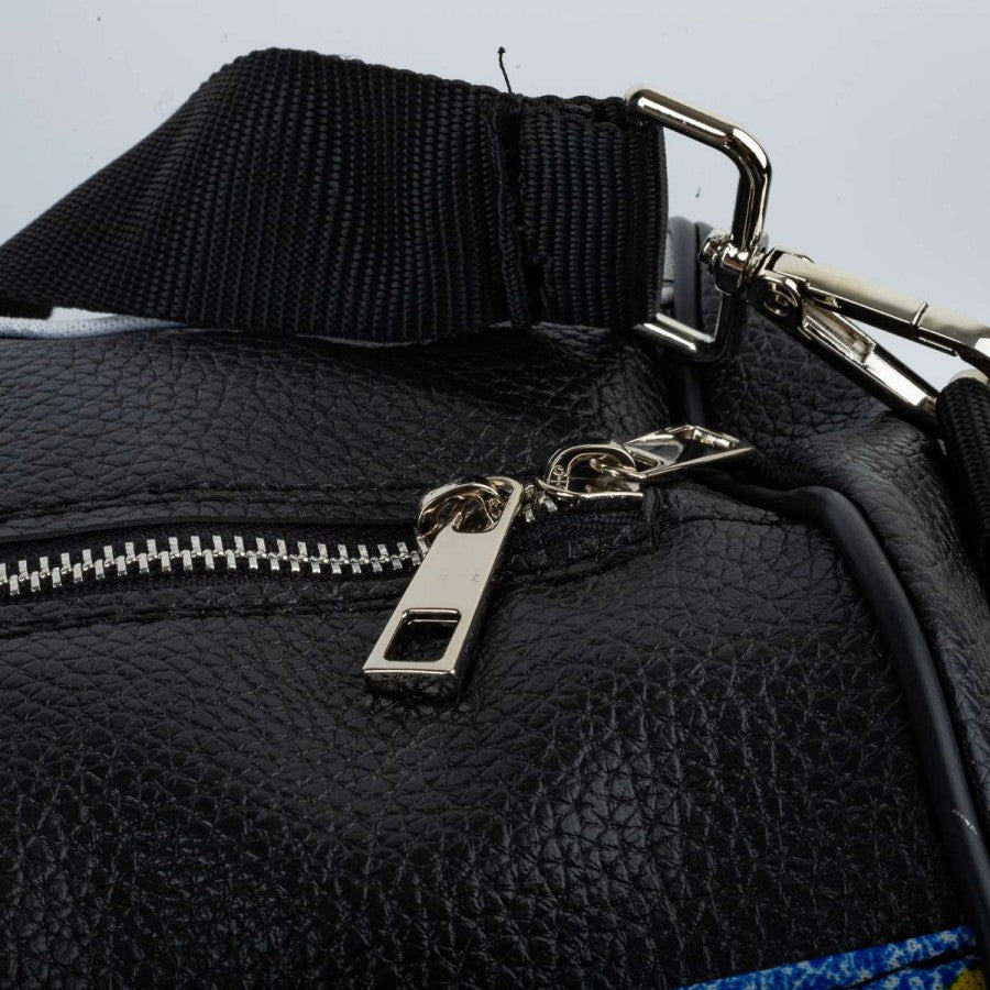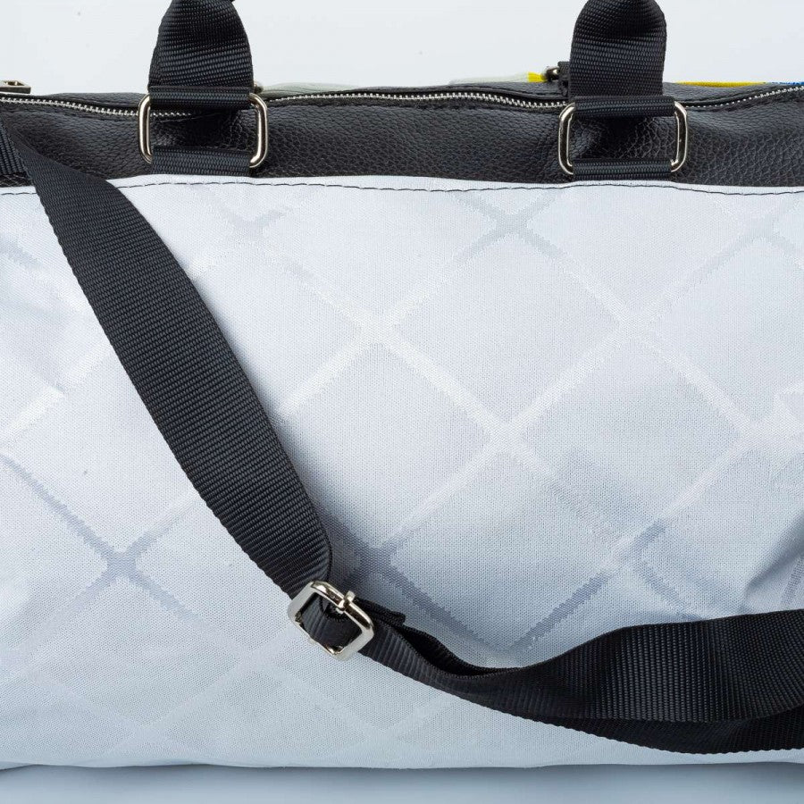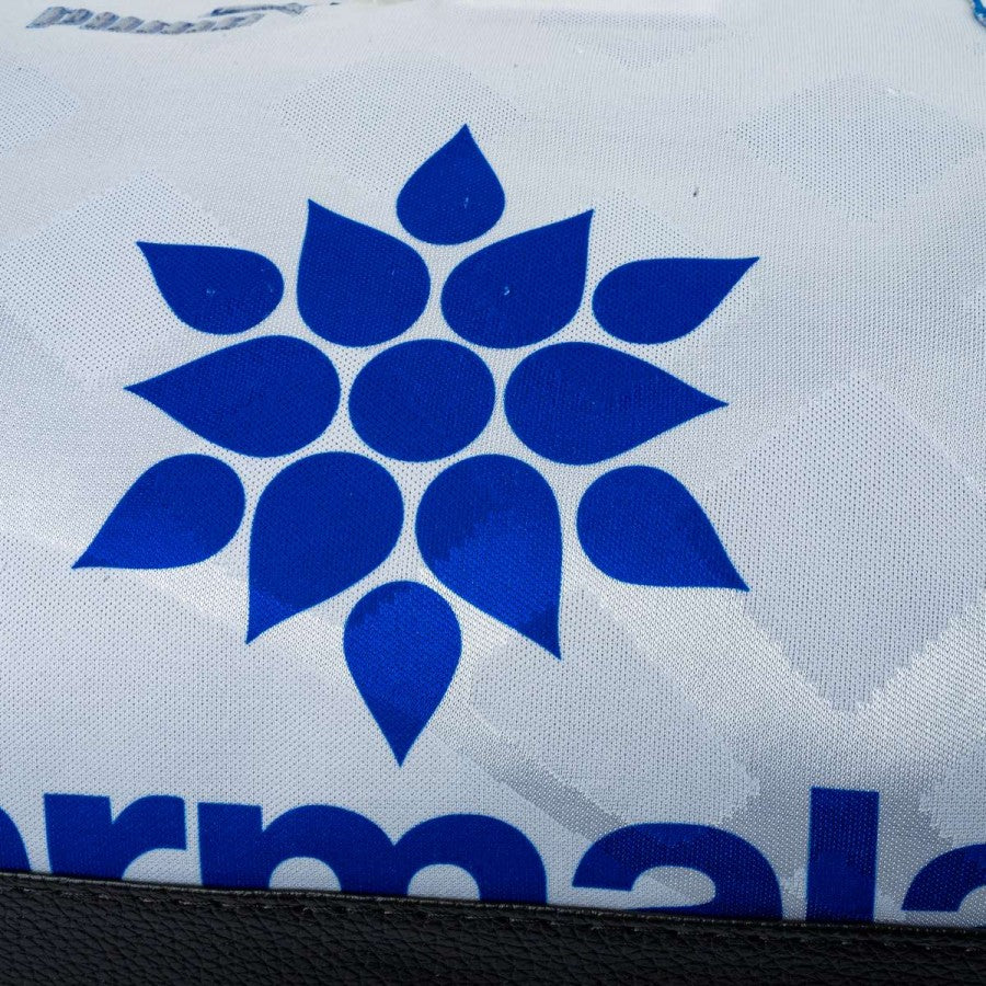 Borsone artigianale ottenuto dalla maglia originale del Parma stagione 1995/1996, prodotta da Puma. Base bianca con pattern geometrico, inserti gialli e blu a effetto “spruzzato” sulle spalle. Logo Puma e sponsor Parmalat applicati, stemma Parma A.C. cucito sul petto. Retro in pelle sintetica nera, manici rinforzati e tracolla regolabile. Pezzo unico realizzato a mano in Italia da una maglia vintage da gara.