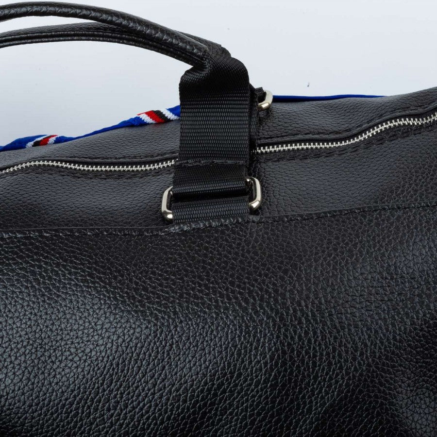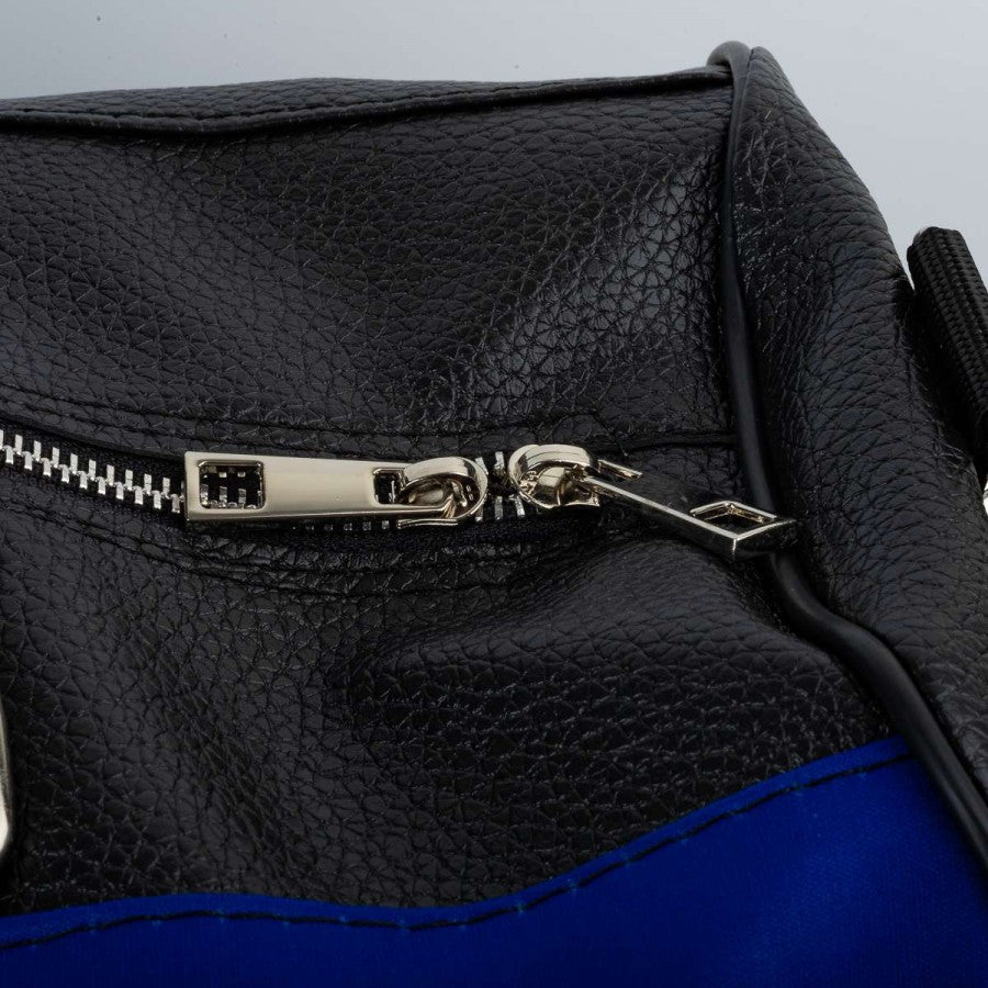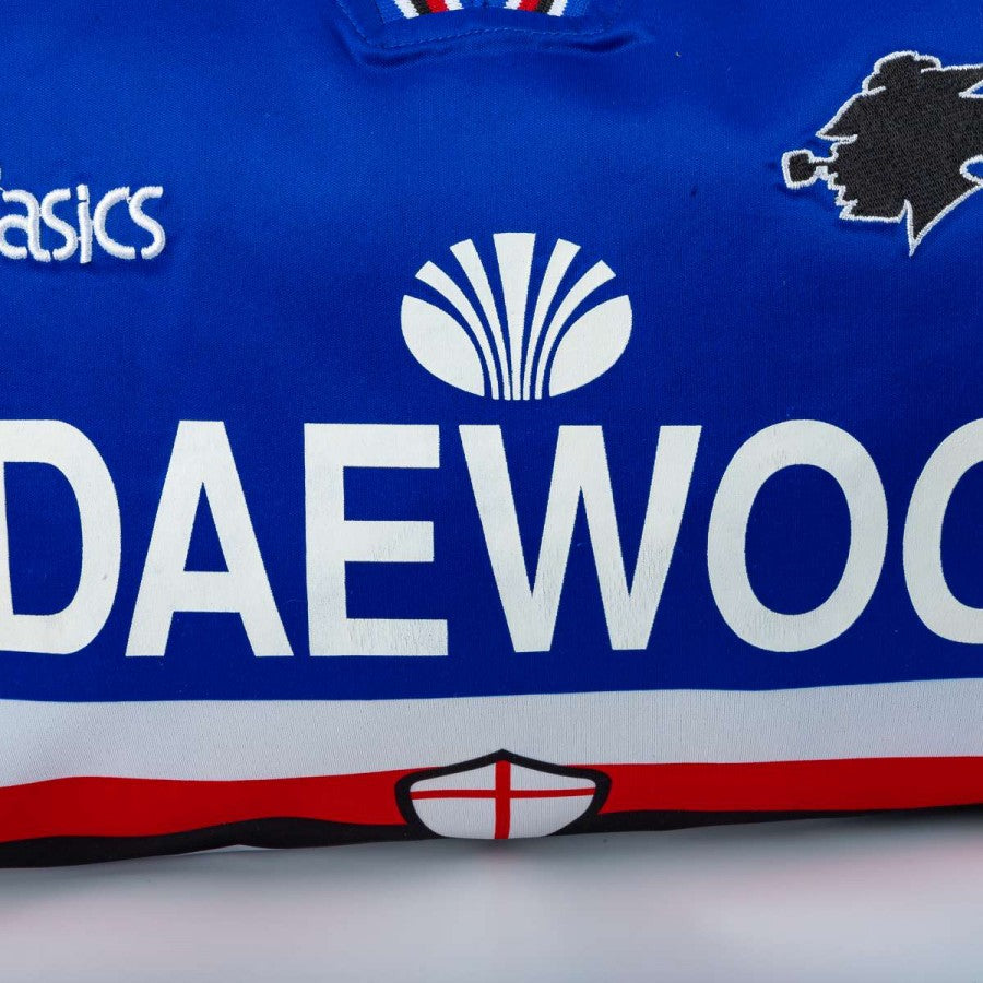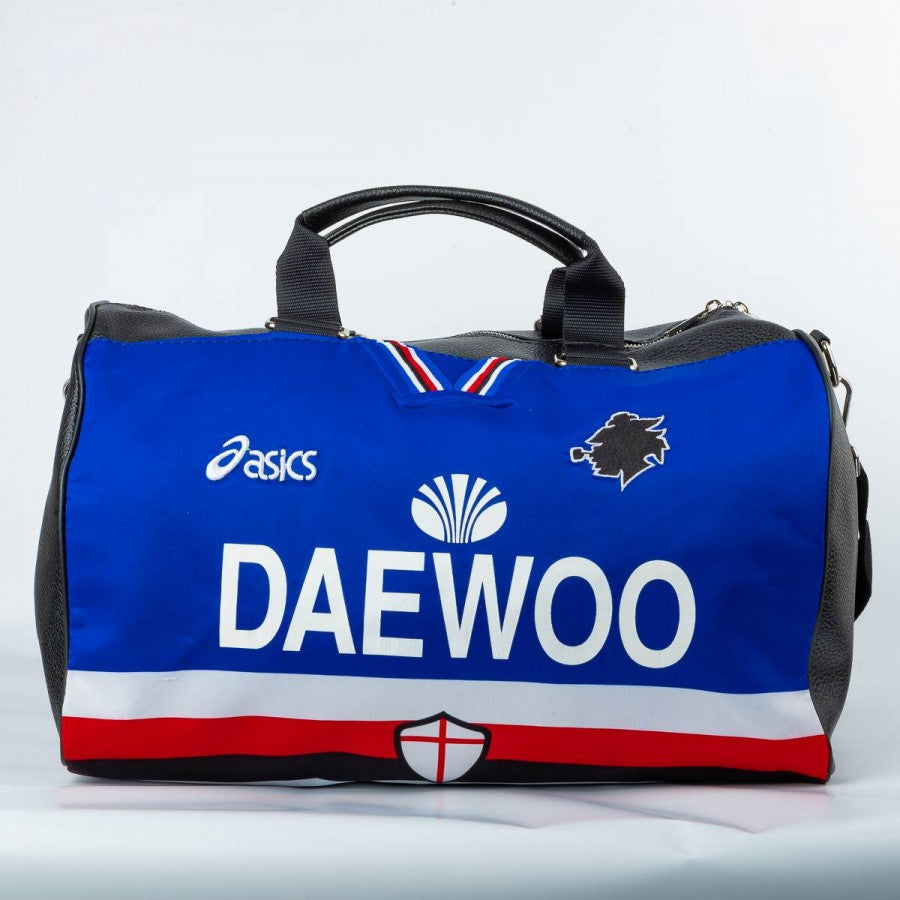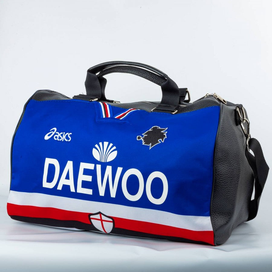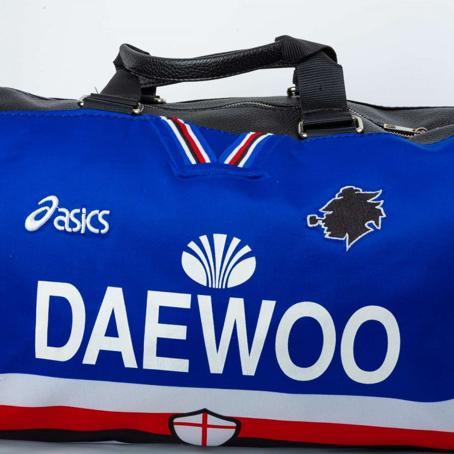Borsone artigianale "Seconda Pelle" realizzato a partire dalla maglia home della Sampdoria stagione 1997/1998, firmata Asics. Colore blu con fascia blucerchiata e sponsor Daewoo. Logo Asics ricamato e stemma della Sampdoria applicato lato cuore. Retro in ecopelle nera con tracolla regolabile e manici resistenti. Pezzo unico che unisce moda e passione calcistica.