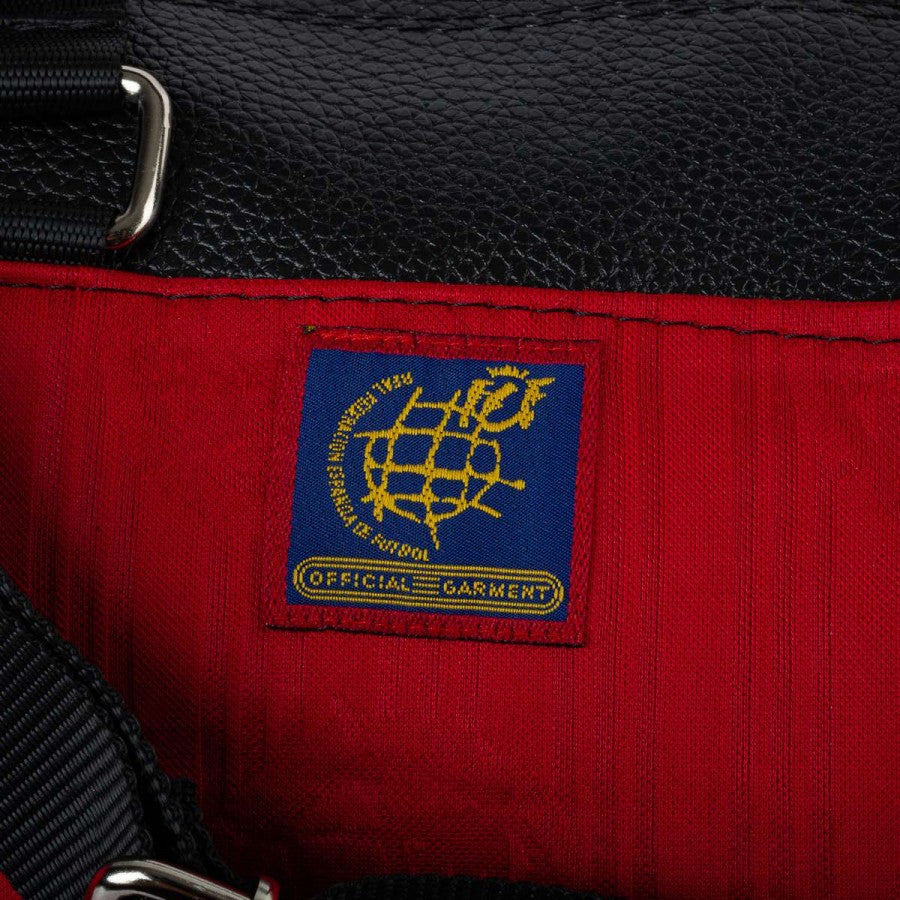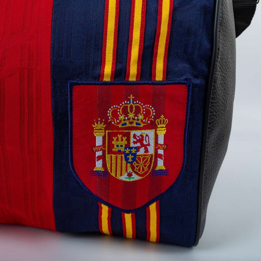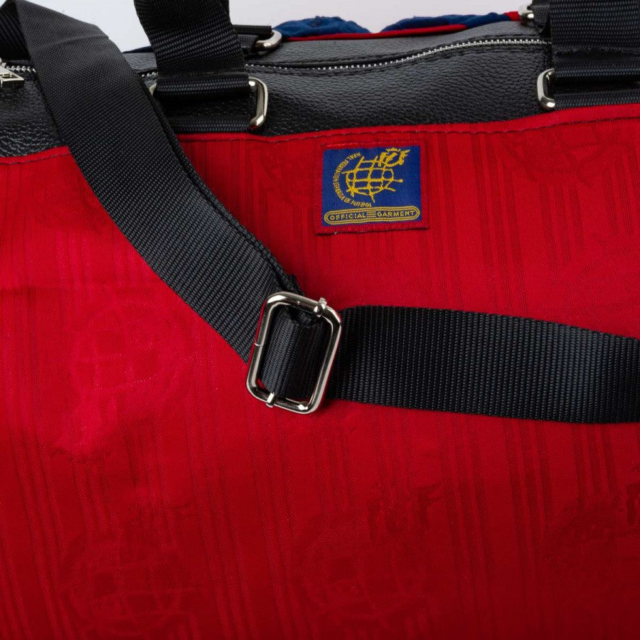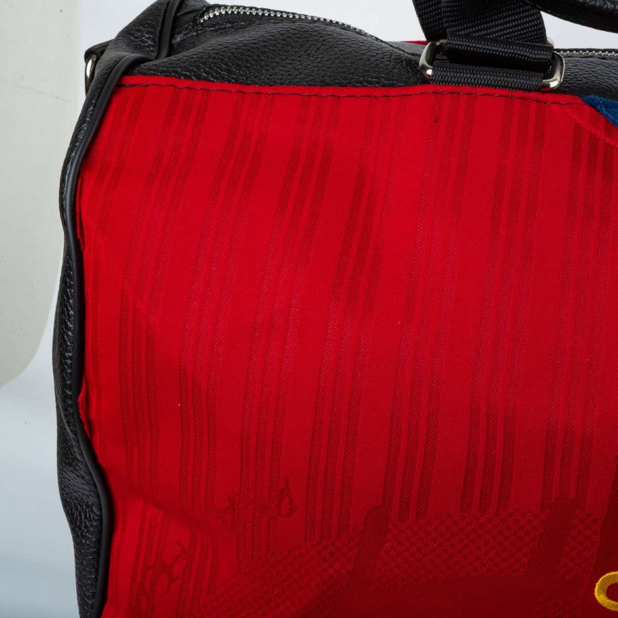 orsone artigianale modello “Seconda Pelle” realizzato utilizzando la maglia home della Spagna stagione 1996. Tessuto rosso con banda blu e dettagli gialli, logo adidas ricamato sul petto e stemma federale cucito sul lato cuore. Manici in pelle nera, tracolla regolabile e chiusura con zip. Pezzo unico, cucito a mano in Italia.