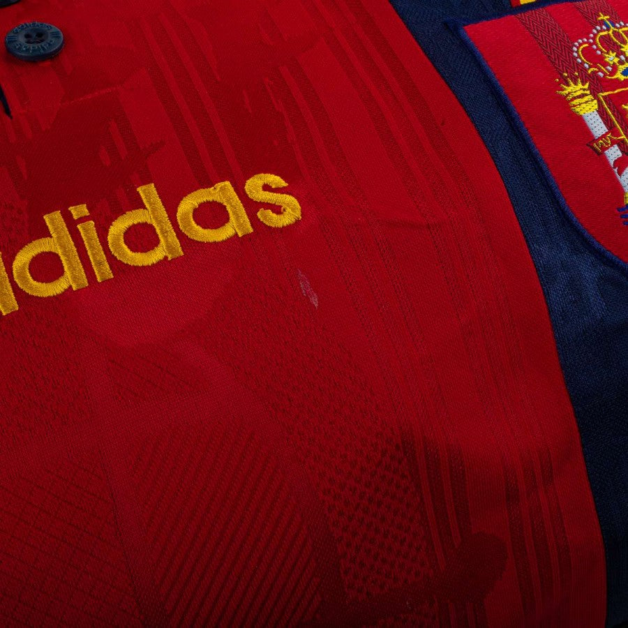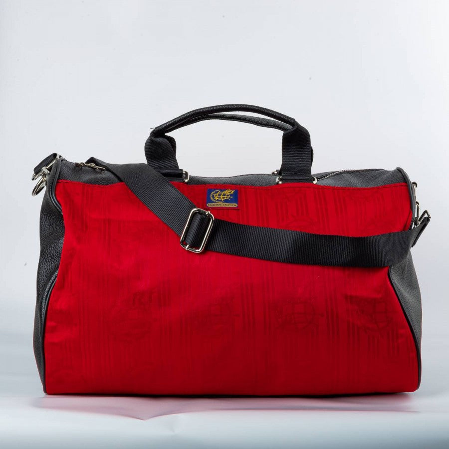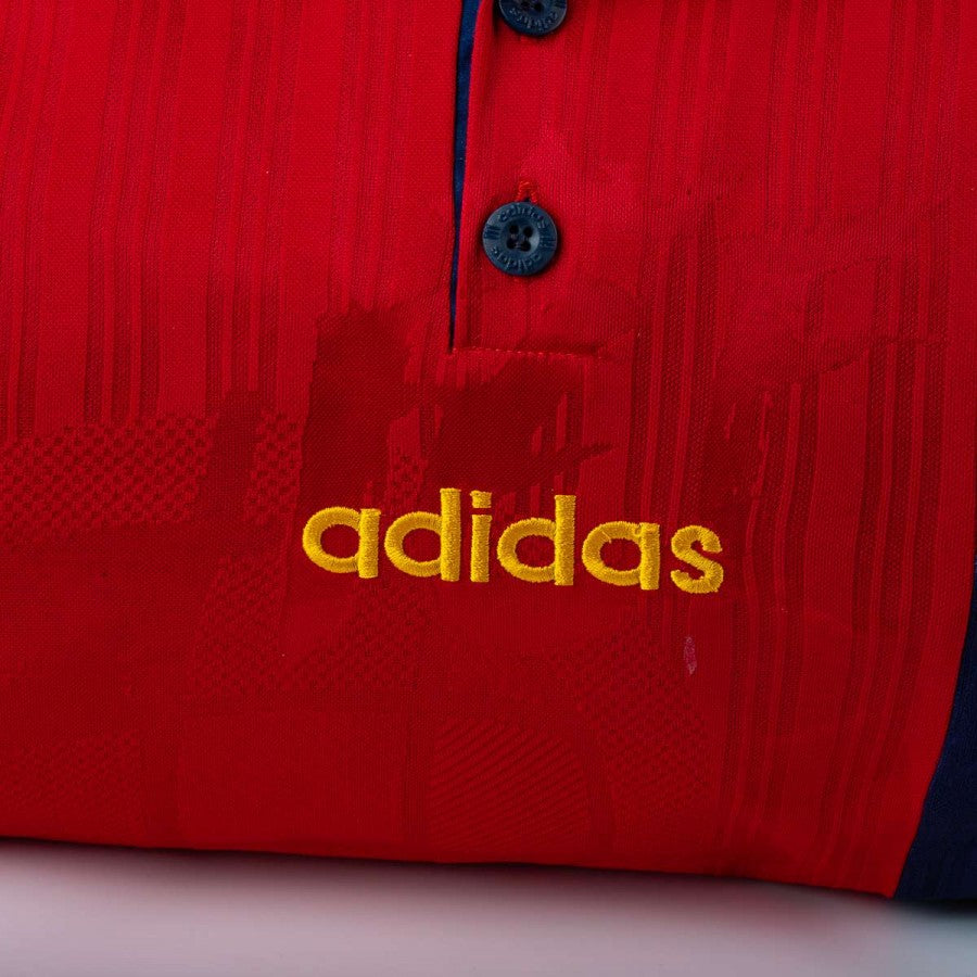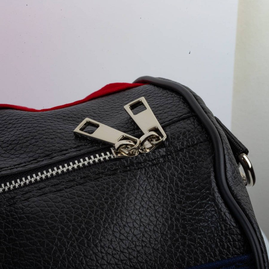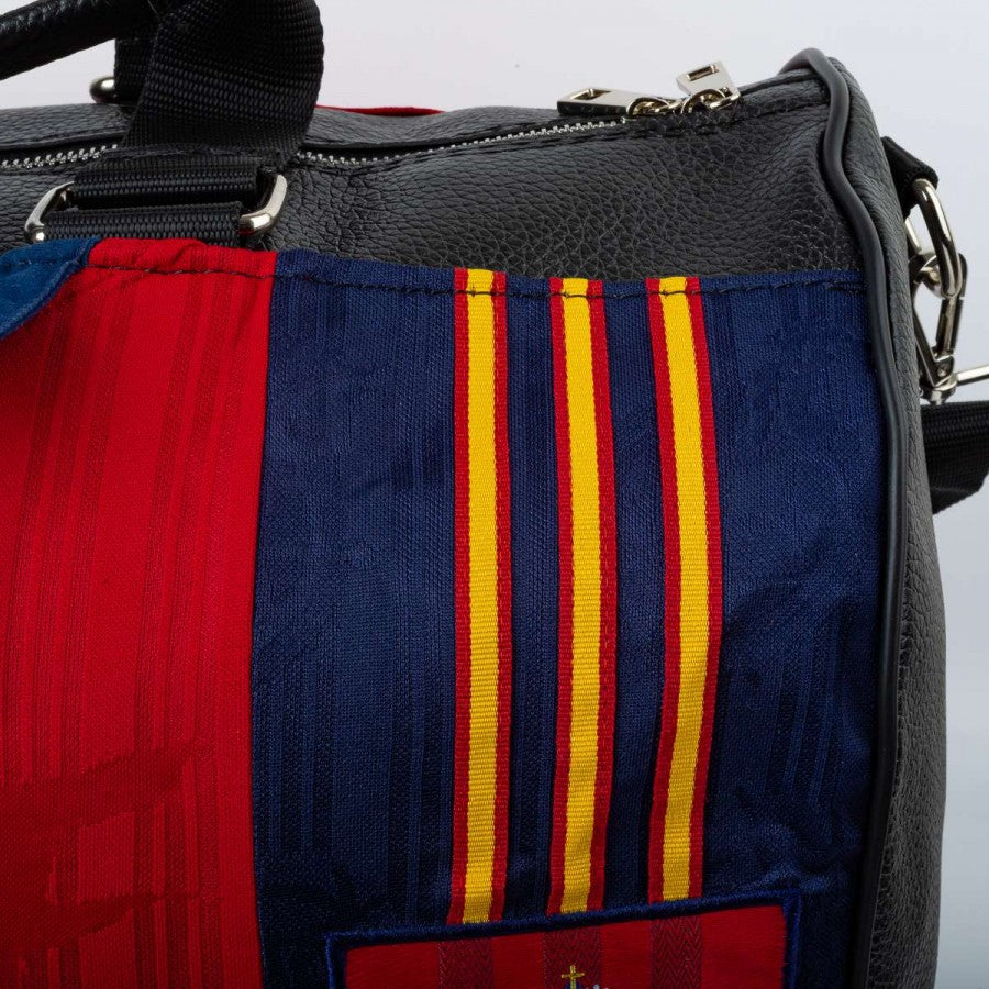 orsone artigianale modello “Seconda Pelle” realizzato utilizzando la maglia home della Spagna stagione 1996. Tessuto rosso con banda blu e dettagli gialli, logo adidas ricamato sul petto e stemma federale cucito sul lato cuore. Manici in pelle nera, tracolla regolabile e chiusura con zip. Pezzo unico, cucito a mano in Italia.