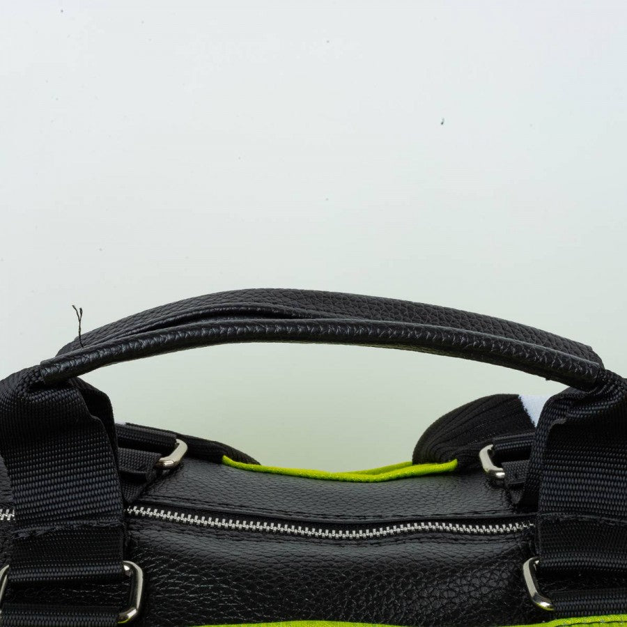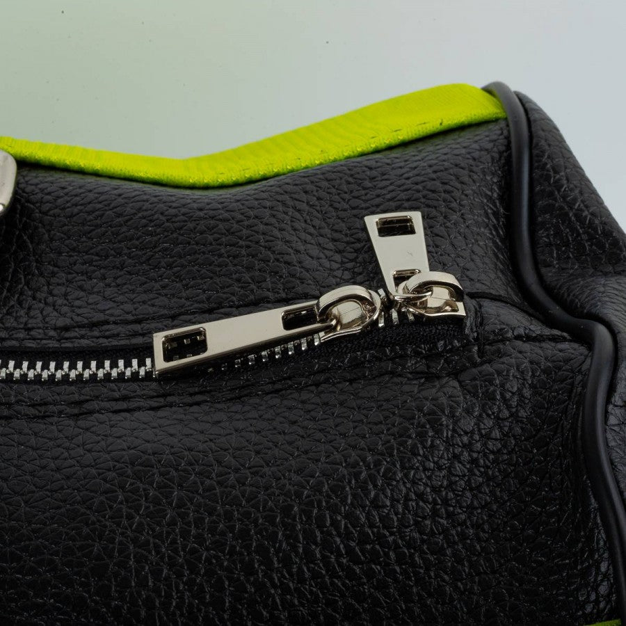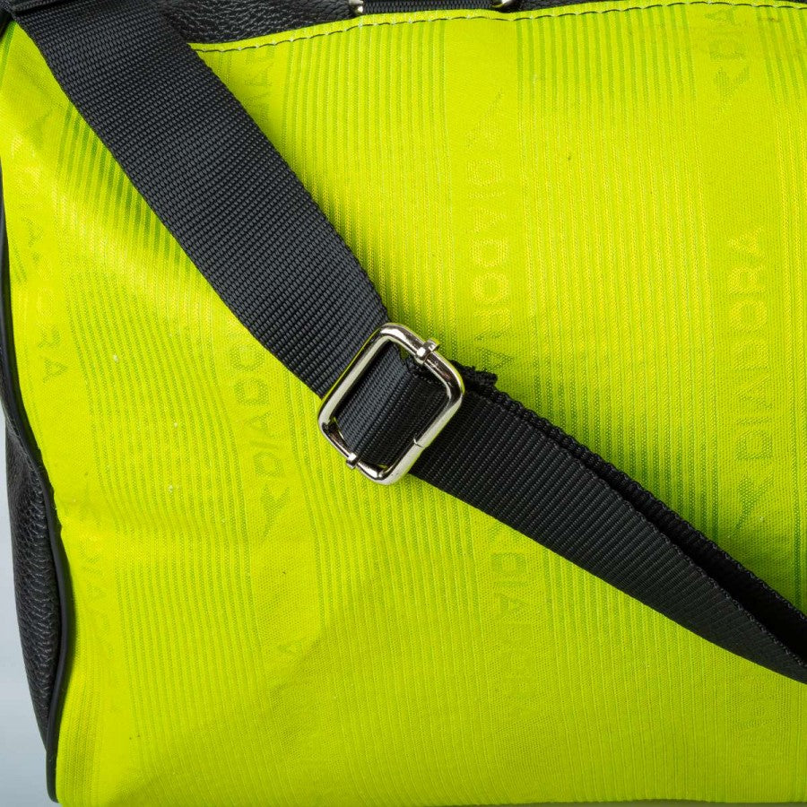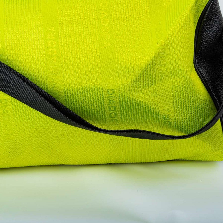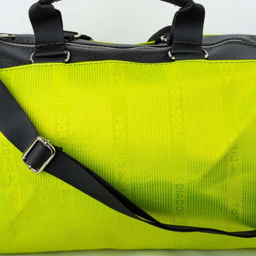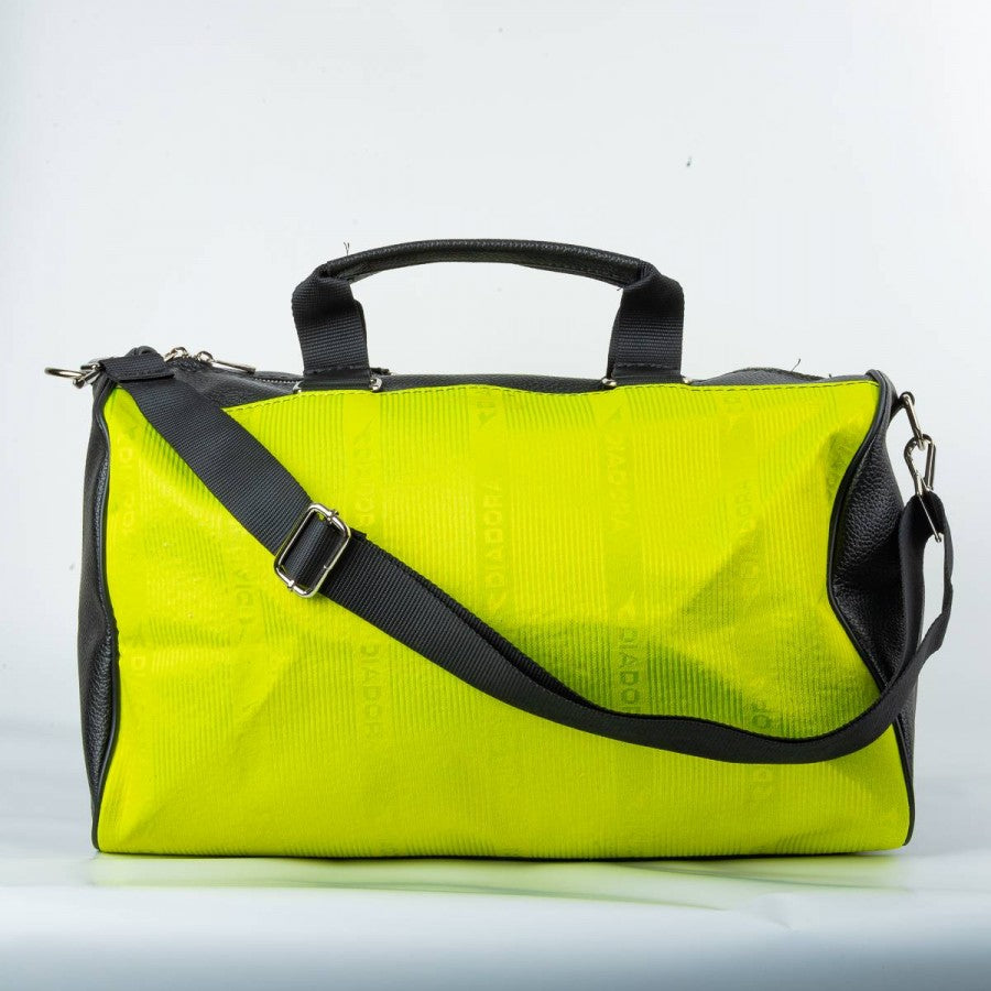 Borsone artigianale “Seconda Pelle” realizzato a partire dalla maglia da portiere dell'Udinese della stagione 1999/2000, firmata Diadora. Colore giallo fluo con dettagli neri, logo Diadora applicato e stemma del club ricamato lato cuore. Sponsor Telit centrale. Manici e tracolla in pelle nera con zip in metallo. Un pezzo unico da collezione, fatto a mano in Italia.
