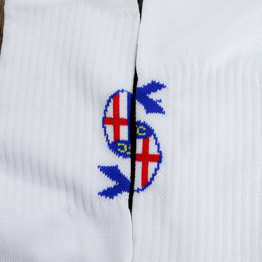 Calzerotti ufficiali da trasferta del Bologna F.C., stagione 1999/2000, realizzati dal sponsor tecnico Diadora. I calzettoni, di colore bianco, presentano dettagli con le iconiche righe rosse e blu sul bordo superiore e il logo del club ricamato in evidenza. Pensati per garantire comfort e resistenza, questi calzettoni rappresentano un pezzo unico per i collezionisti e i tifosi del Bologna.