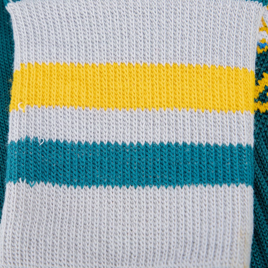 Il prodotto è ben visibile dalle foto che lo riguardano. Il colore principale è il blu, ma in realtà la sezione iniziale del calzettone è bianca, con due piccole fasce orizzontali, nella trama del tessuto, leggermente distanti, in giallo e, ancora, in blu chiaro; poco sopra la caviglia il tessuto dell'articolo presenta delle scanalature, e su questo sfondo poggiano gli ultimi dettagli, cuciti: il logo dell'Inter con a capo la classica stella e, al di sotto di questo, il logo della Umbro, sponsor tecnico del club all'epoca, anch'esso in giallo.