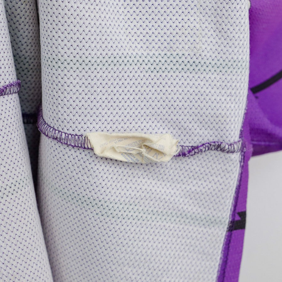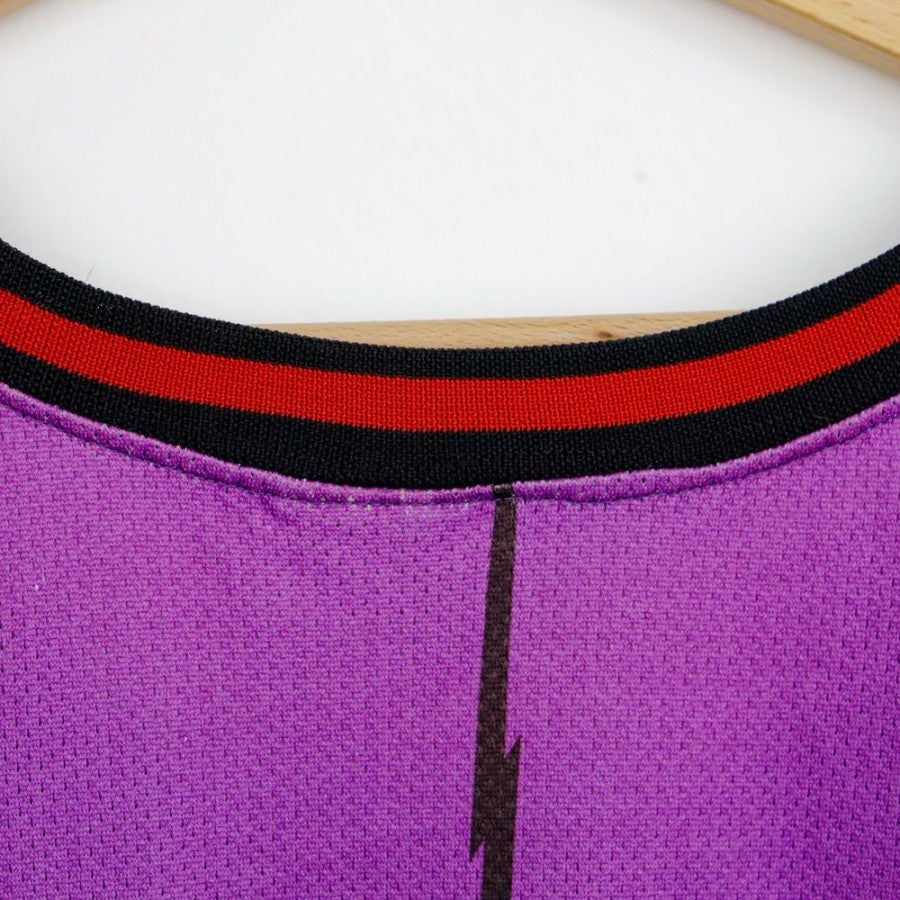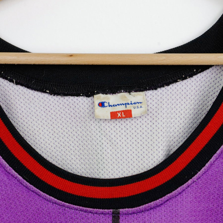 Canotta ufficiale dei Toronto Raptors, prodotta dallo sponsor tecnico Champion, personalizzata con il nome Stoudamire e il numero 20. Questo modello Home, utilizzato nei primi anni della franchigia canadese, presenta il celebre design viola con dettagli neri e rossi. Sul petto è stampato il logo dei Raptors con il caratteristico dinosauro rosso che palleggia, accompagnato dal numero 20. Sul retro, il nome Stoudamire è applicato sopra il numero 20, incorniciato dal motivo a graffi che richiama le unghie del raptor. Il logo NBA è cucito sulla spalla, mentre l'etichetta Champion è visibile nella parte inferiore della maglia. Taglia XL.