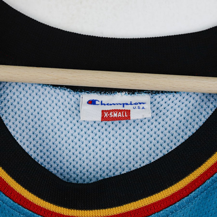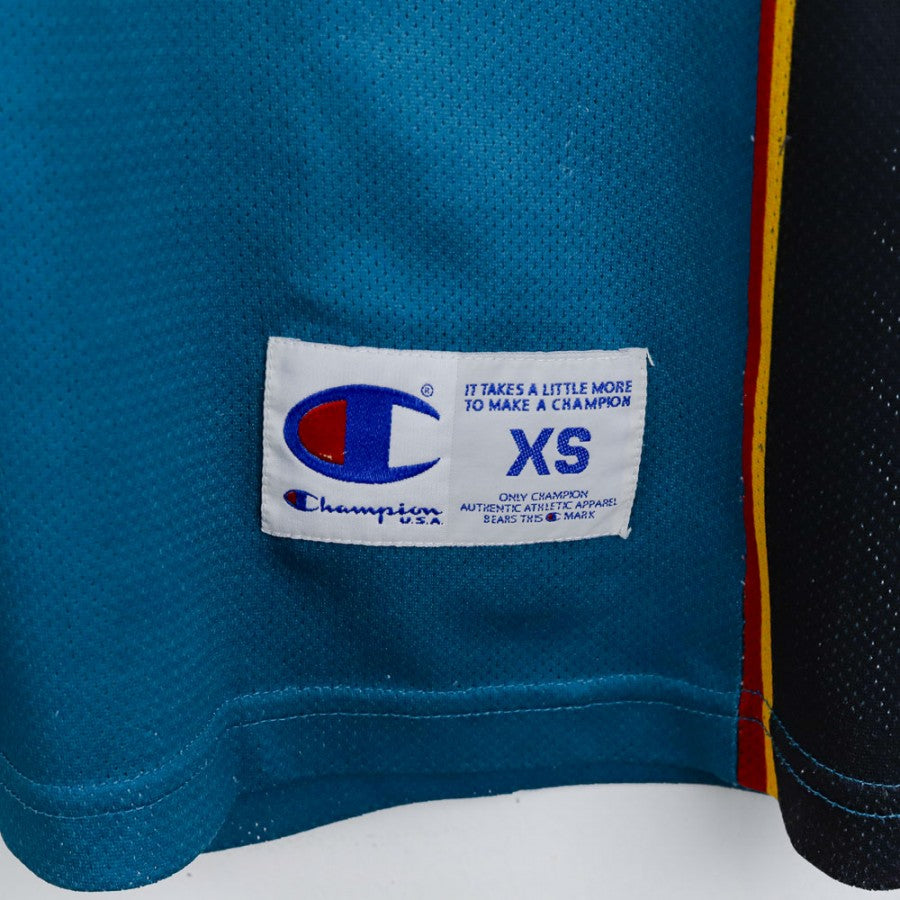 Canotta ufficiale dei Detroit Pistons, prodotta dallo sponsor tecnico Champion, personalizzata con il nome Hill e il numero 33. Questo iconico modello è caratterizzato dal design blu teal, utilizzato dai Pistons negli anni ‘90, con dettagli rossi, neri e gialli. Sul petto spicca il logo della squadra con il cavallo fiammeggiante, mentre il nome Hill e il numero 33 sono stampati sul retro. Il logo NBA è cucito sulla spalla, mentre il marchio Champion è presente sull'etichetta nella parte inferiore della maglia. Taglia XS.