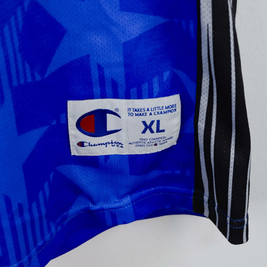 Canotta ufficiale degli Orlando Magic, prodotta dallo sponsor tecnico Champion, personalizzata con il nome Armstrong e il numero 10. Questo modello presenta il classico colore blu degli Orlando Magic con una grafica a stelle tono su tono, dettagli neri e argento, e le iconiche strisce verticali sui lati. Il logo Magic è stampato in grande sul petto, mentre il nome del giocatore e il numero sono applicati sul retro. Il logo NBA è cucito sulla spalla, mentre l'etichetta Champion è presente nella parte inferiore della maglia. Taglia XL.