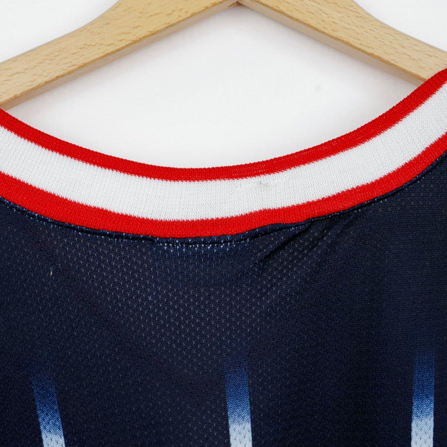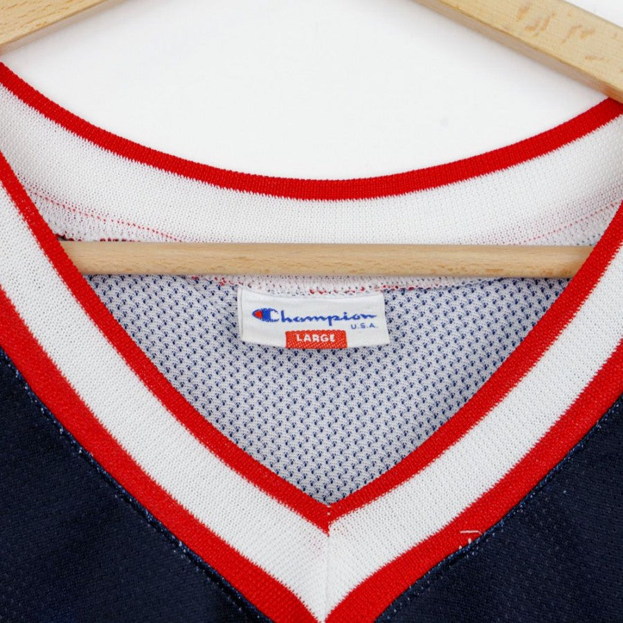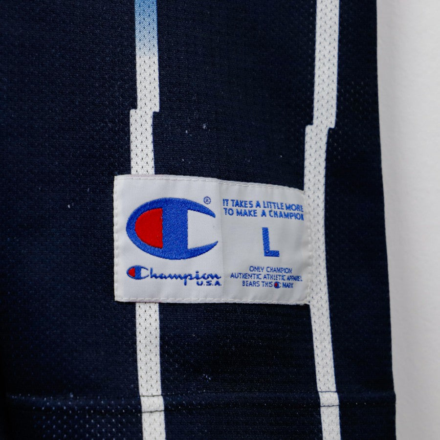 Canotta ufficiale degli Houston Rockets, prodotta dallo sponsor tecnico Champion, personalizzata con il nome Olajuwon e il numero 34. Questo modello home presenta il design iconico della fine degli anni '90, con base blu scuro e strisce verticali bianche che richiamano il tema spaziale della franchigia. Sul petto è presente il logo Rockets con un razzo in stile cartoon, accompagnato dal numero 34. Sul retro, il nome Olajuwon è applicato sopra il numero 34, rendendo omaggio al leggendario centro nigeriano naturalizzato statunitense. Il logo NBA è cucito sulla spalla, mentre l'etichetta Champion si trova nella parte inferiore. Taglia L.