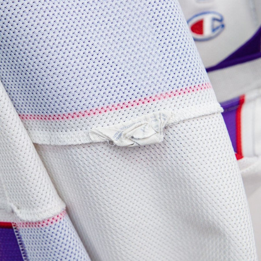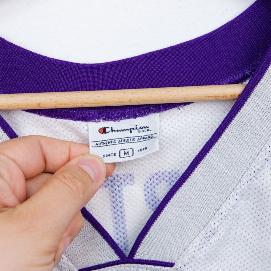 Canotta ufficiale dei Toronto Raptors, prodotta dallo sponsor tecnico Champion, personalizzata con il nome Carter e il numero 15. Questo modello iconico presenta il design bianco con dettagli viola, rossi e grigi, caratteristico delle divise dei Raptors a cavallo tra gli anni ‘90 e 2000. Sul petto è stampato il nome Raptors con il numero 15, mentre sul retro spicca la personalizzazione con il nome Carter e il numero 15. Il logo NBA è cucito sulla spalla, mentre il marchio Champion è presente sull'etichetta nella parte inferiore della maglia. Taglia M.
