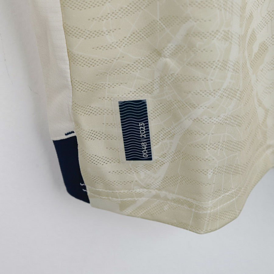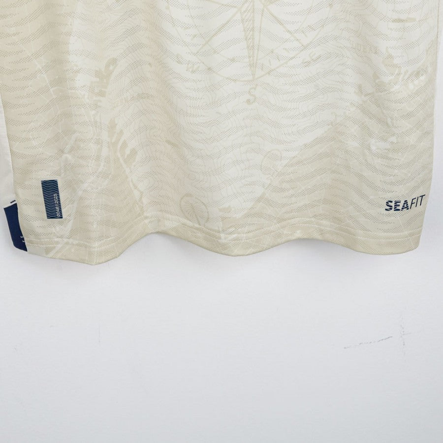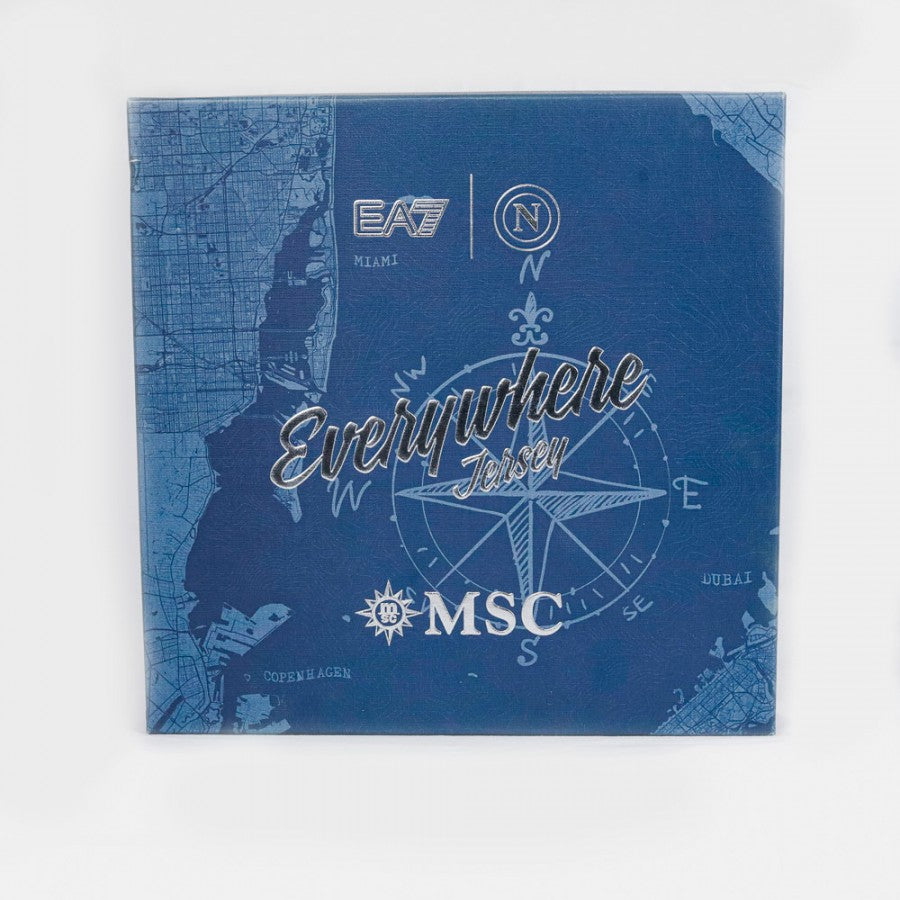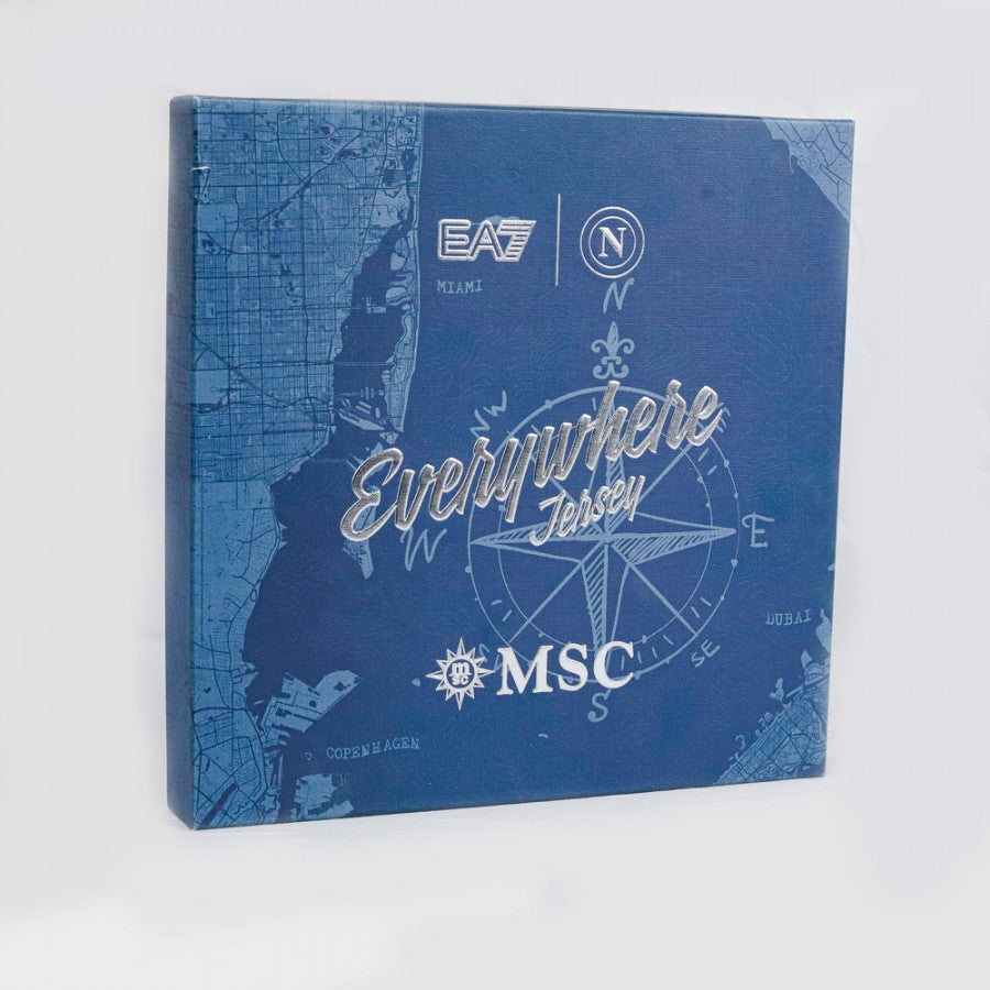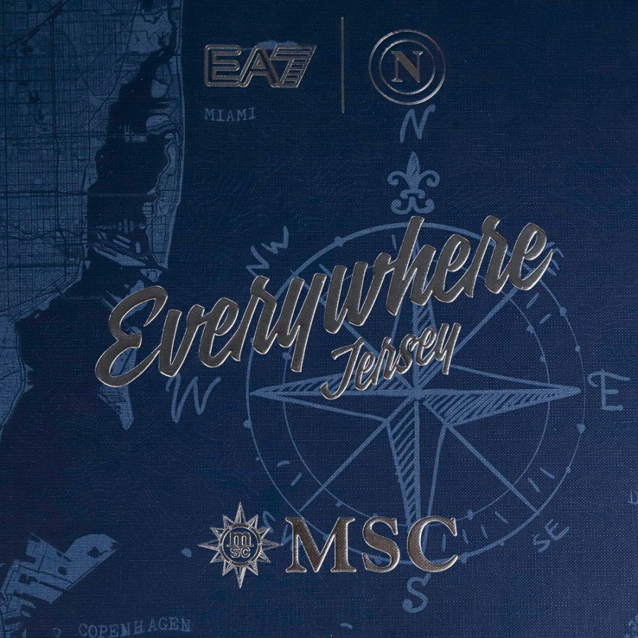 Maglia ufficiale del Napoli, edizione speciale per la stagione 2023/2024, realizzata dallo sponsor tecnico EA7. Questo modello, chiamato "Everywhere Jersey", celebra la partnership con MSC e presenta un elegante colore beige con dettagli blu navy su colletto e maniche. Lo scudetto tricolore, simbolo del titolo conquistato nella stagione precedente, è applicato sul petto insieme al logo EA7, allo stemma del Napoli e al main sponsor MSC. La trama della maglia include una grafica in rilievo ispirata alle carte nautiche, in linea con il tema marittimo. Sul retro è personalizzata con il nome del giocatore Lobotka e il numero 68, oltre al logo dello sponsor secondario Upbit e alla patch ufficiale della Serie A TIM sulla manica destra. La maglia è presentata in un cofanetto esclusivo, perfetto per i collezionisti. Taglia: M.