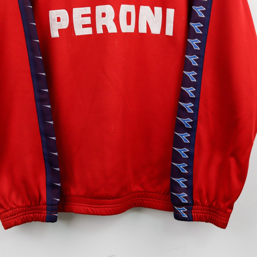 Felpa Allenamento Napoli Diadora Rossa 2000/2001 in classico stile training anni 2000. Il modello presenta una base rossa con bande blu scuro lungo le maniche, arricchite da ripetizioni del logo tecnico Diadora. Sul petto e sulla schiena spiccano lo sponsor commerciale Peroni e il logo del club SSC Napoli, entrambi in bianco. Il colletto e i polsini sono in maglia elastica a costine per un maggiore comfort.