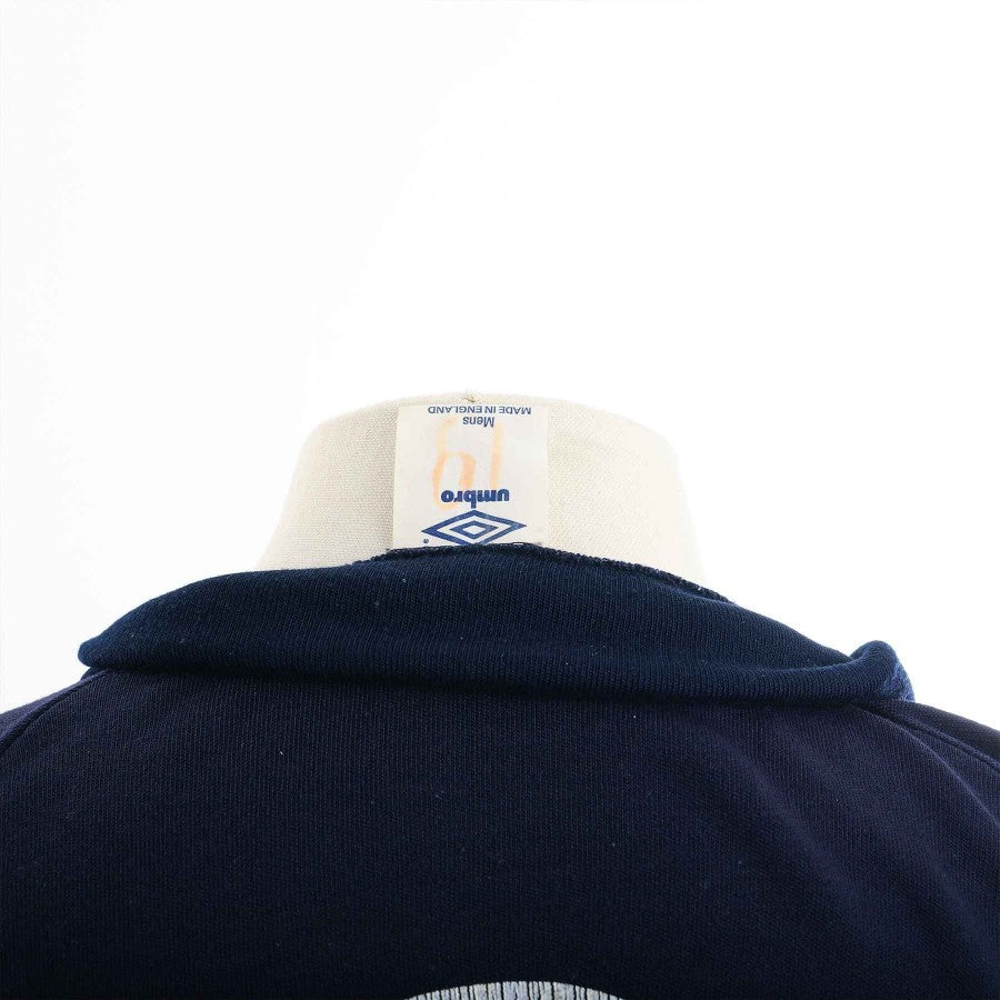 Felpa da allenamento del Cagliari stagione 1991/1992 di colore blu con inserti rossi sulle maniche. Lettering CAGLIARI CALCIO lato cuore, loghi Umbro e Formaggi Ovini Sardi applicati sia sul fronte che sul retro.