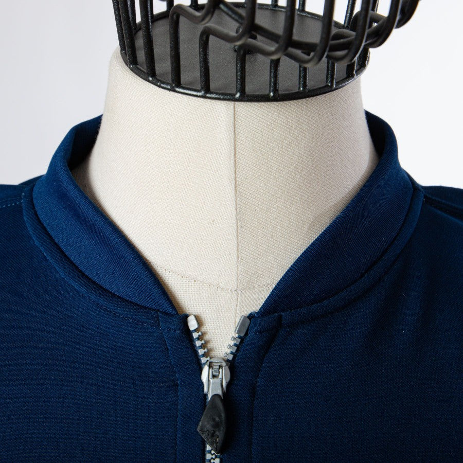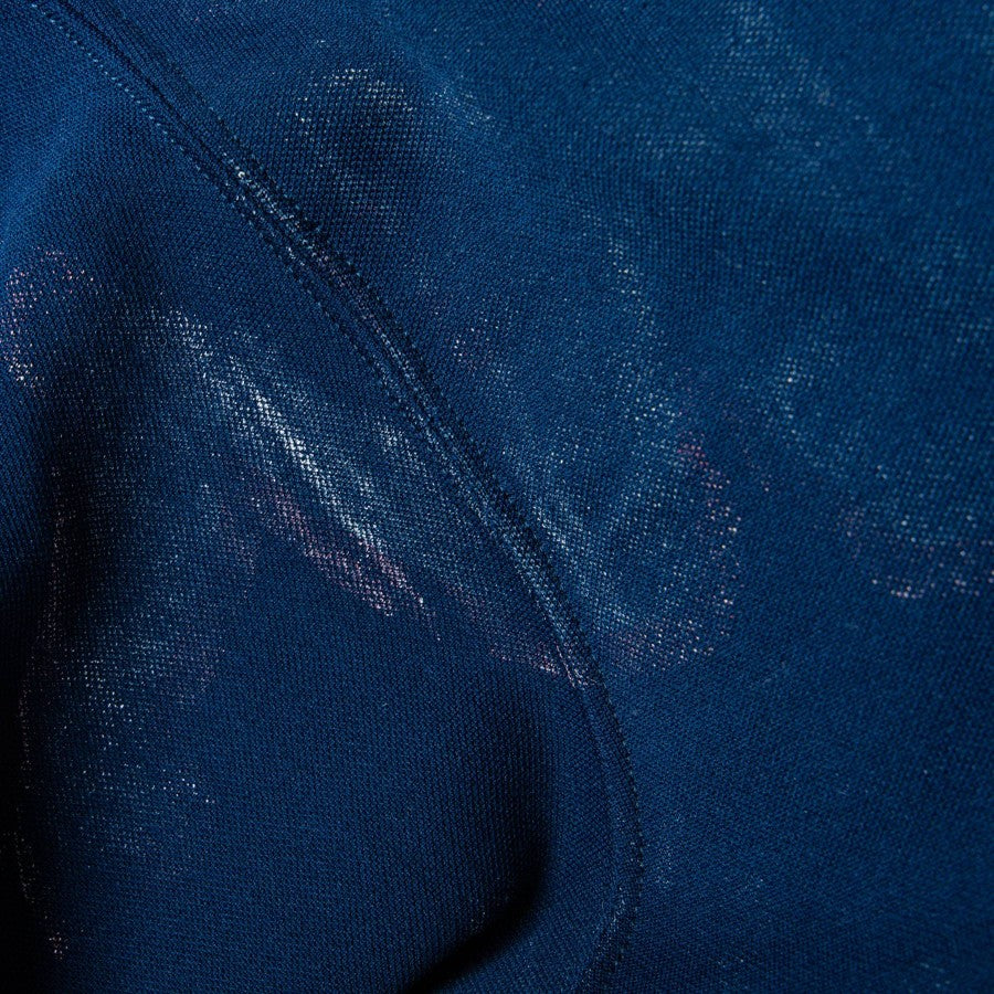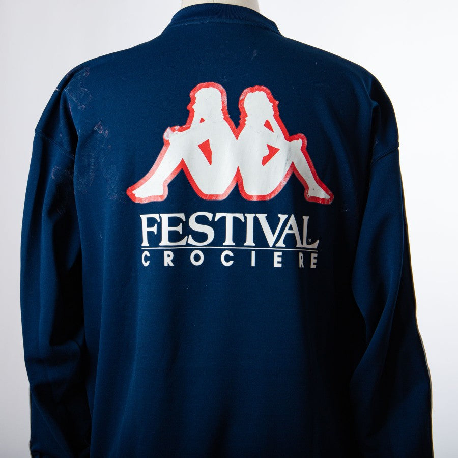 Modello a mezza zip di colore blu. In ricamo sul fronte il logo dello sponsor tecnico Kappa sulla destra e dello sponsor commerciale Festival Crociere sulla sinistra.