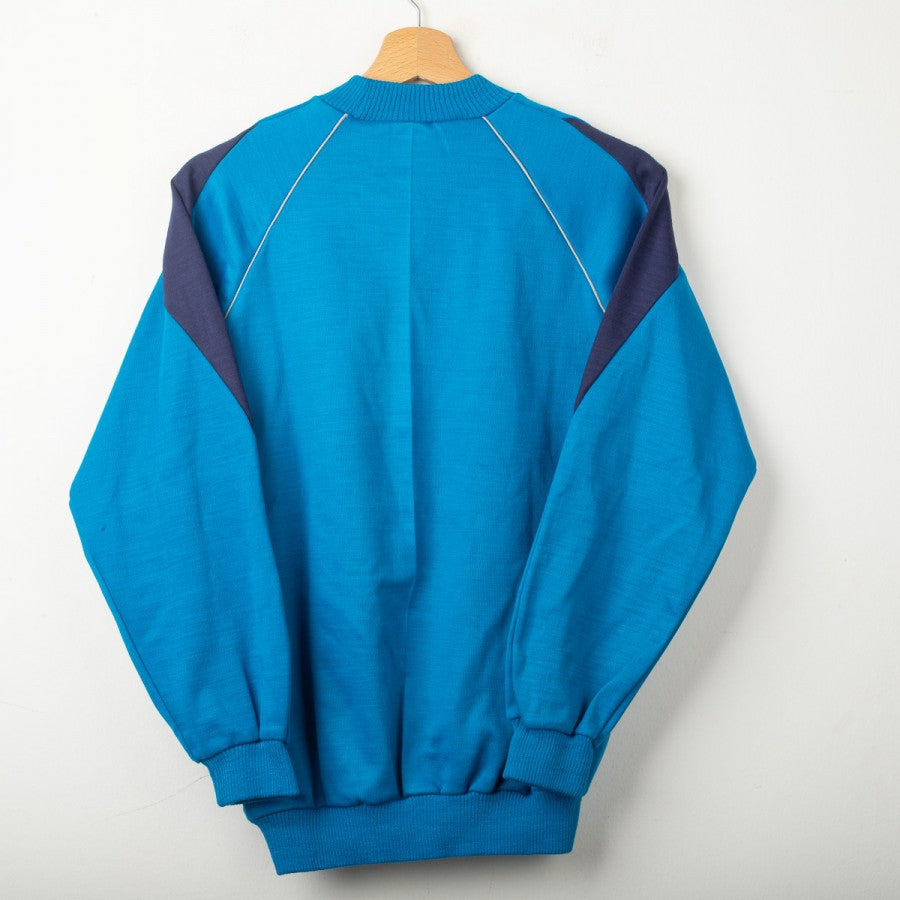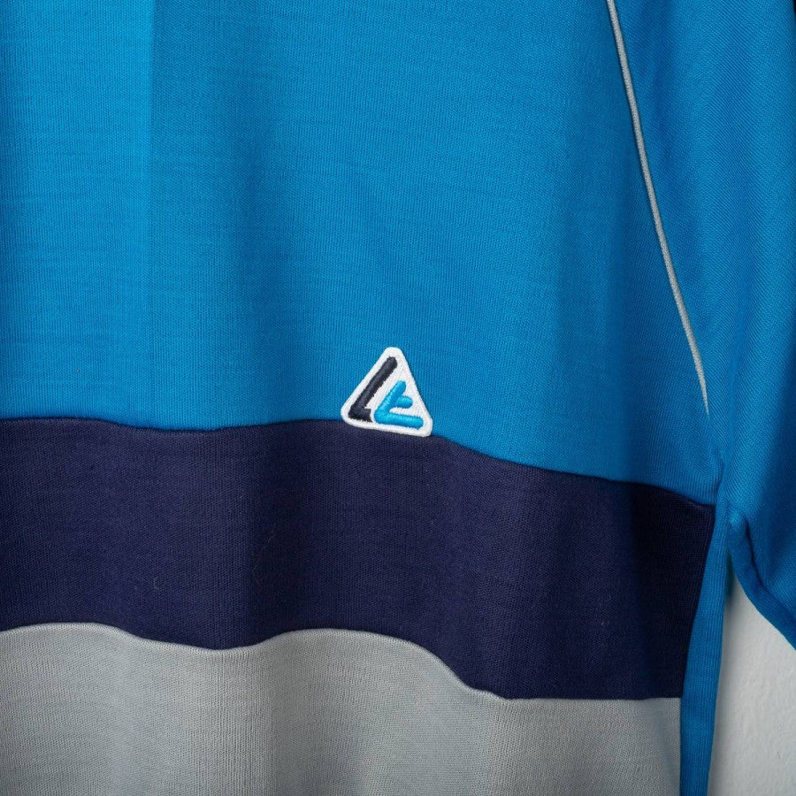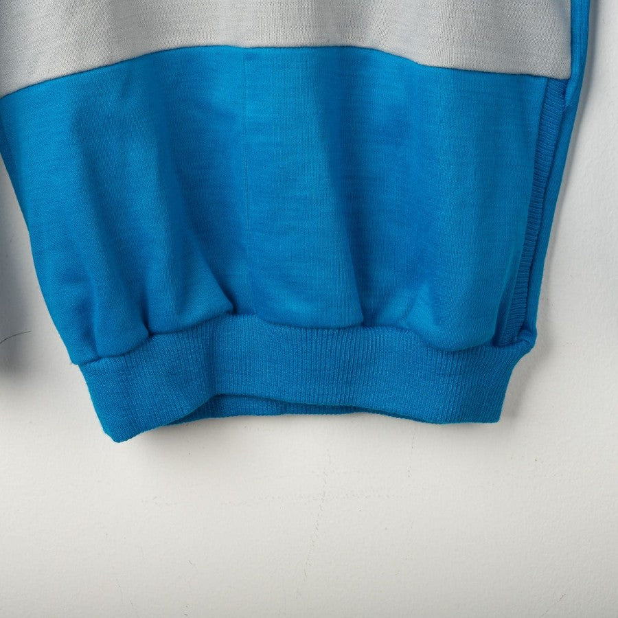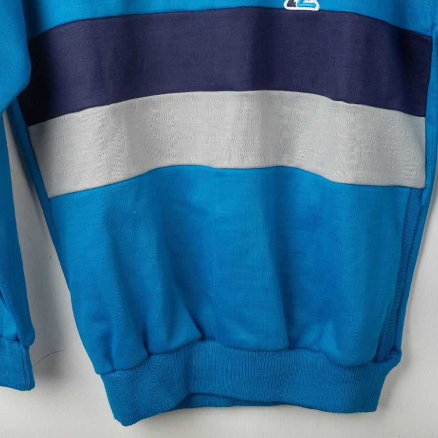 Felpa Linea Time 1984/1985, taglia 46 (corrispondente a una S/M), realizzata in Italia dal marchio Linea Time. Presenta una combinazione di colori tipica dell'estetica anni '80, con bande blu navy e grigio chiaro che attraversano il corpo centrale su base azzurra. Il logo Linea Time è applicato sul petto, mentre il design con cuciture a contrasto evidenzia le linee delle maniche.