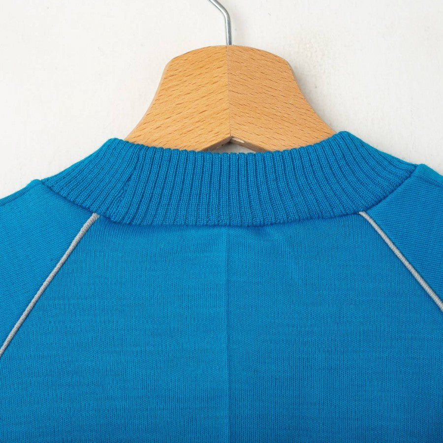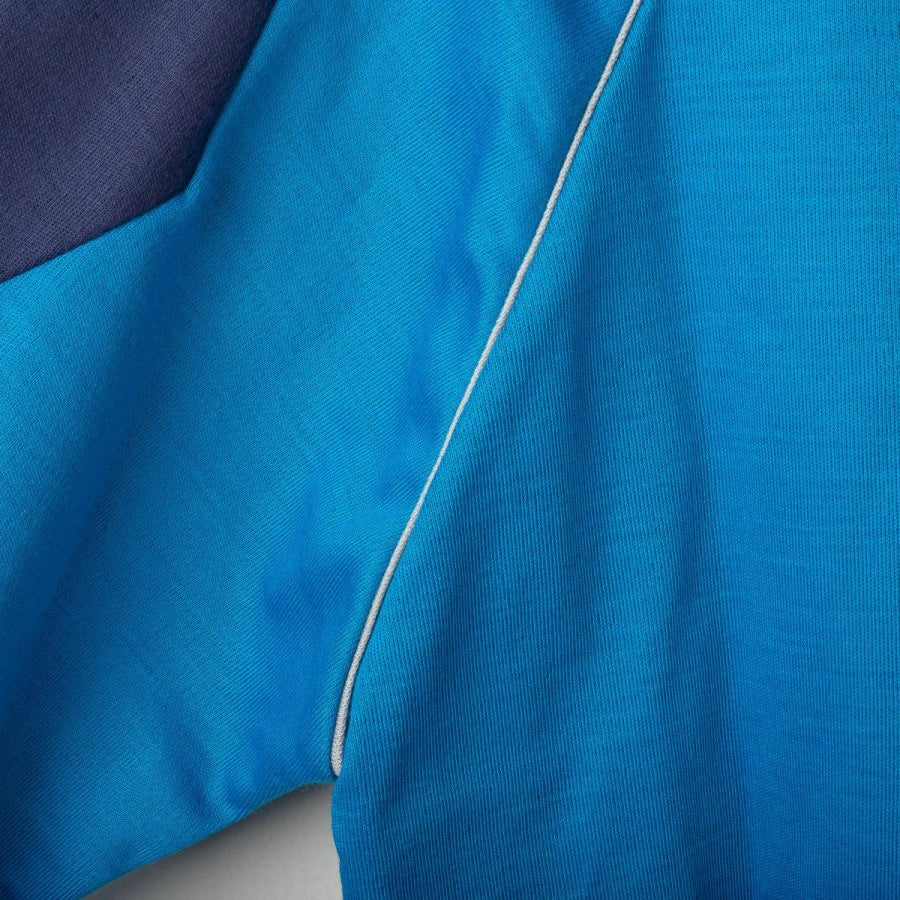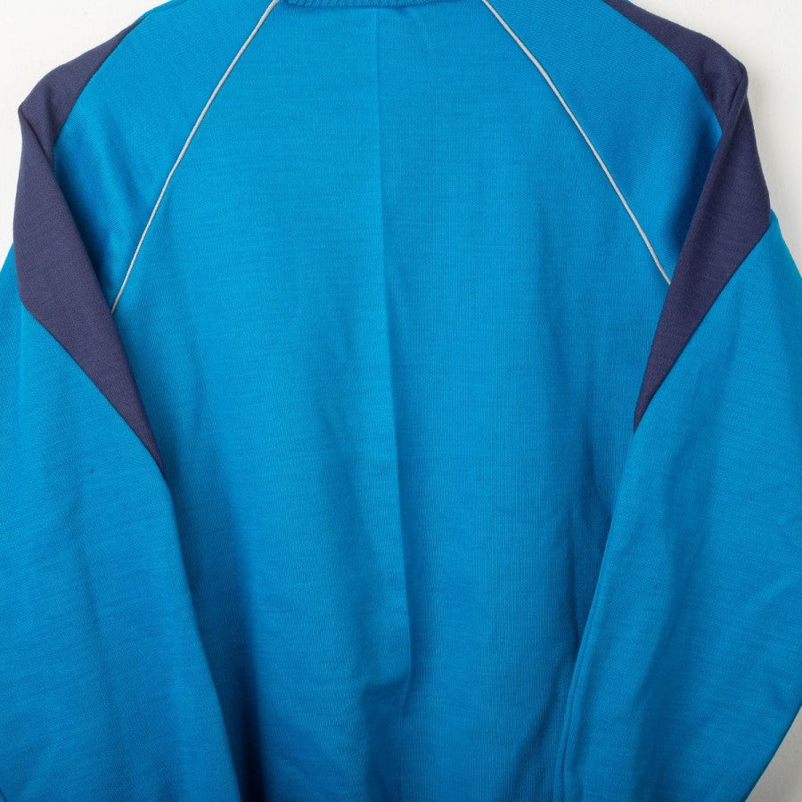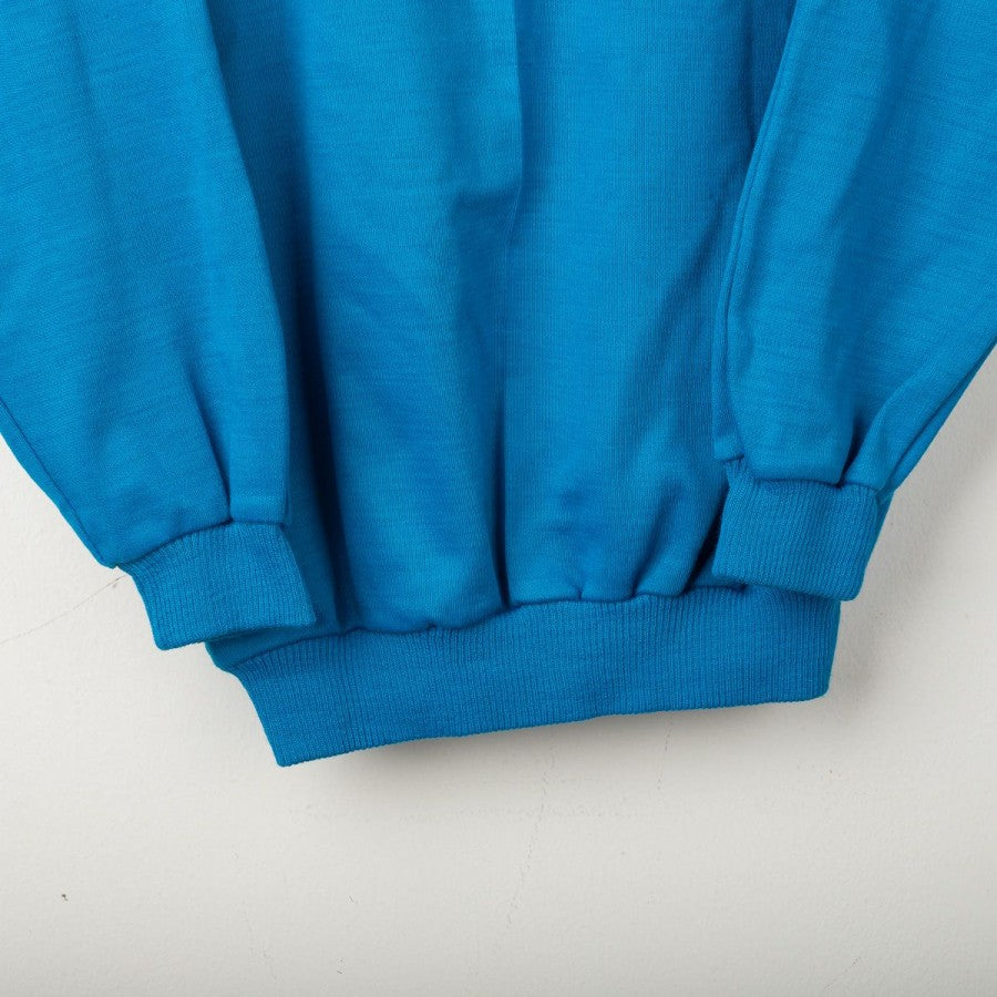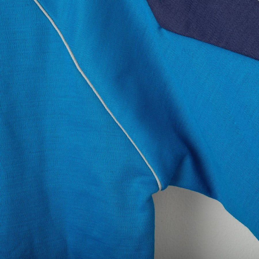 Felpa Linea Time 1984/1985, taglia 46 (corrispondente a una S/M), realizzata in Italia dal marchio Linea Time. Presenta una combinazione di colori tipica dell'estetica anni '80, con bande blu navy e grigio chiaro che attraversano il corpo centrale su base azzurra. Il logo Linea Time è applicato sul petto, mentre il design con cuciture a contrasto evidenzia le linee delle maniche.