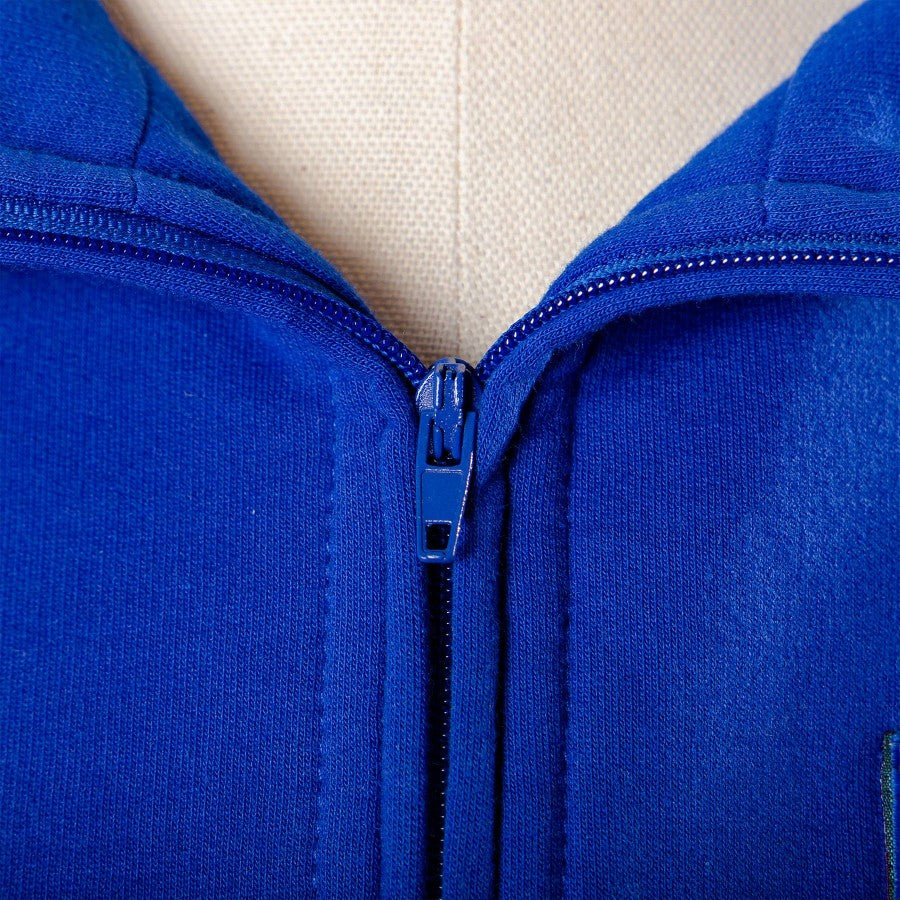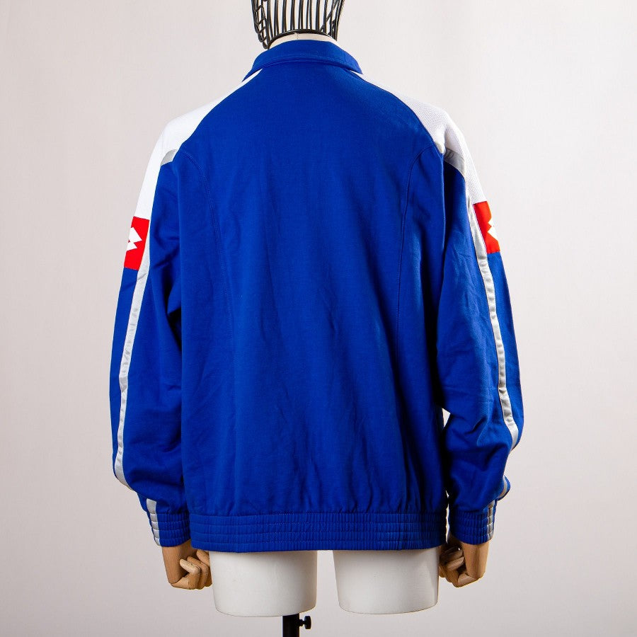 Felpa blu della Serbia, modello a mezza zip di colore blu royal con inserti bianchi e rossi. Elastici in vita ed ai polsi ne conferiscono una vestibilità sportiva. Sulla parte frontale è cucita la patch della Serbia lato cuore e ricamato il logo dello sponsor tecnico Lotto sulla destra. Il logo lotto lo troviamo cucito anche sulle due maniche.