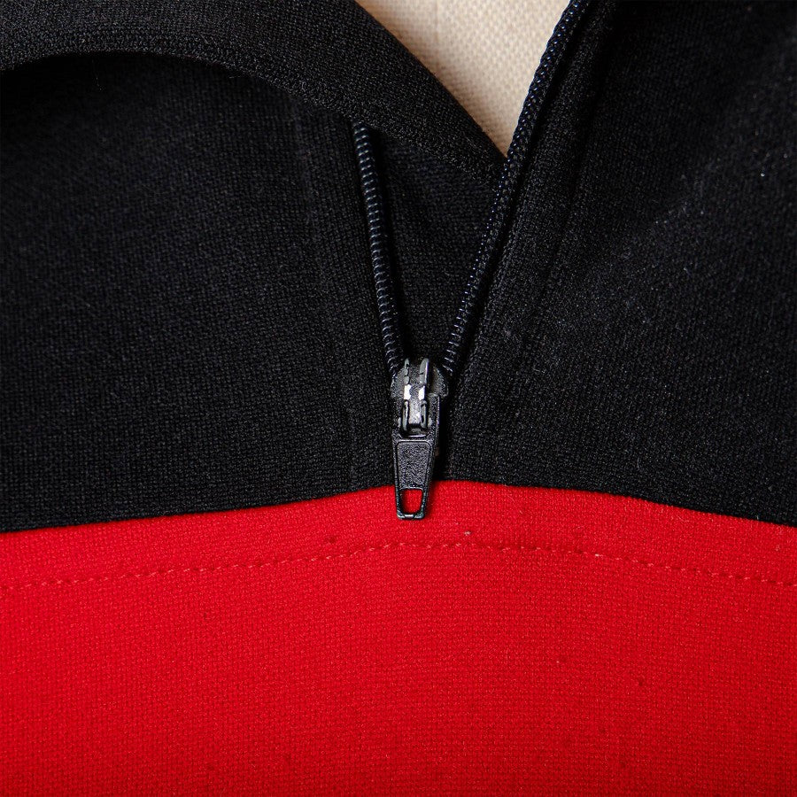 Felpa del Milan, modello a mezza zip. Di colore rosso e nera con inserti grigi, la felpa porta l'elastico in vita ed ai polsi per una migliore vestibilità. Sul fronte è cucita lato cuore la patch del Milan, mentre lo sponsor commerciale Motta e quello tecnico Lotto sono ricamati. Troviamo nuovamente i 2 sponsor anche sul retro, questa volta applicati.