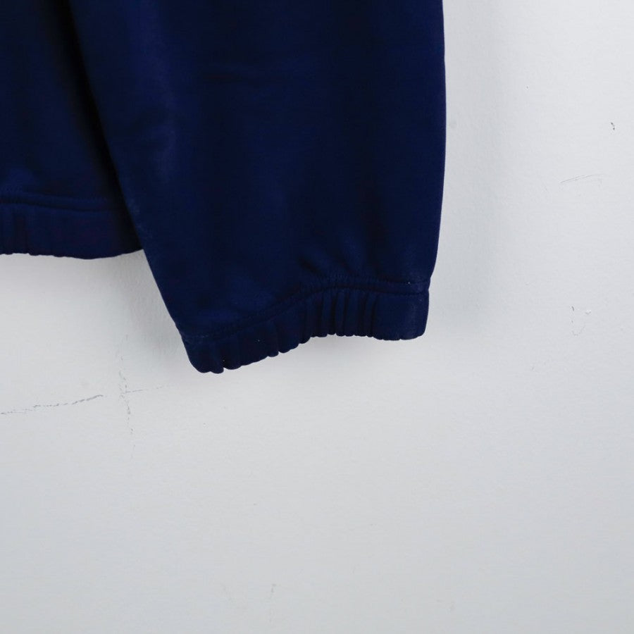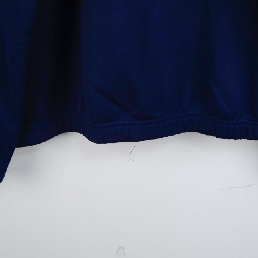 Felpa ufficiale del Napoli, stagione 2009/2010, realizzata dallo sponsor tecnico Diadora. Di colore blu navy, la felpa presenta il logo Diadora sul petto a destra e lo stemma del Napoli sul lato cuore, entrambi ricamati in bianco. Lo sponsor commerciale "Lete" è ben visibile sia sul davanti che sul retro, stampato in rosso con scritta bianca. La chiusura è a zip integrale, e la taglia indicata è XL. Questo capo, perfetto per il tempo libero, combina funzionalità e stile, rendendolo ideale per i tifosi della squadra partenopea.
