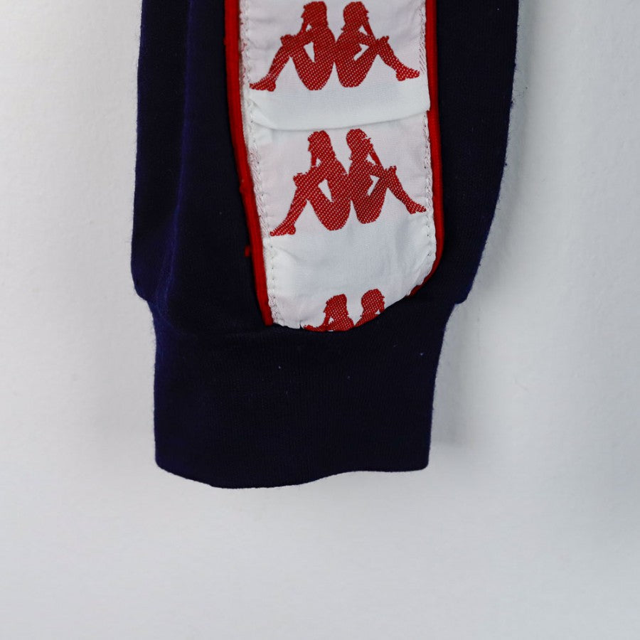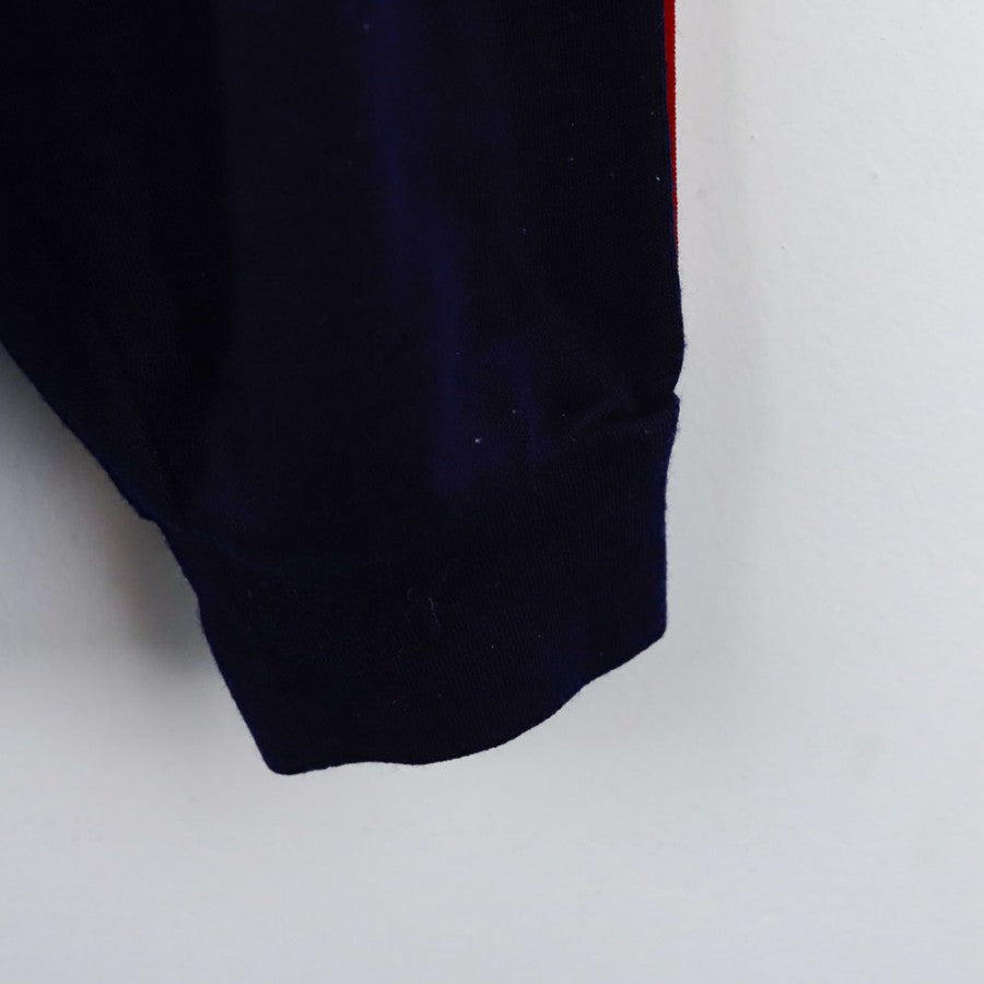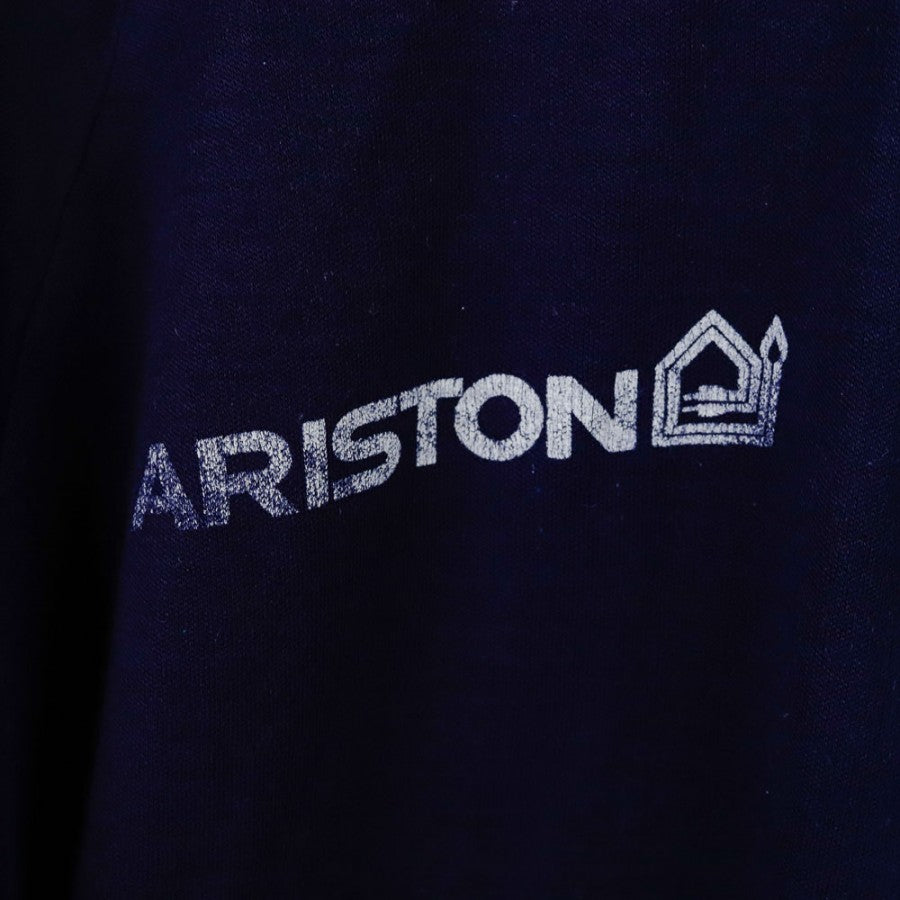 Felpa da allenamento ufficiale della Juventus per la stagione 1984/1985, realizzata dallo sponsor tecnico Kappa. Di colore blu con dettagli bianchi e rossi, presenta il logo Kappa ricamato sul petto e lungo le maniche, mentre sul retro spicca la scritta "Juventus F.C." in bianco. Lo stemma dello sponsor commerciale Ariston è cucito sul lato anteriore, conferendo un tocco distintivo. La felpa è un'autentica rappresentazione dello stile anni '80 della Vecchia Signora. Taglia 50.