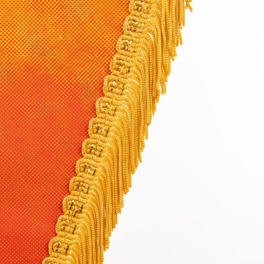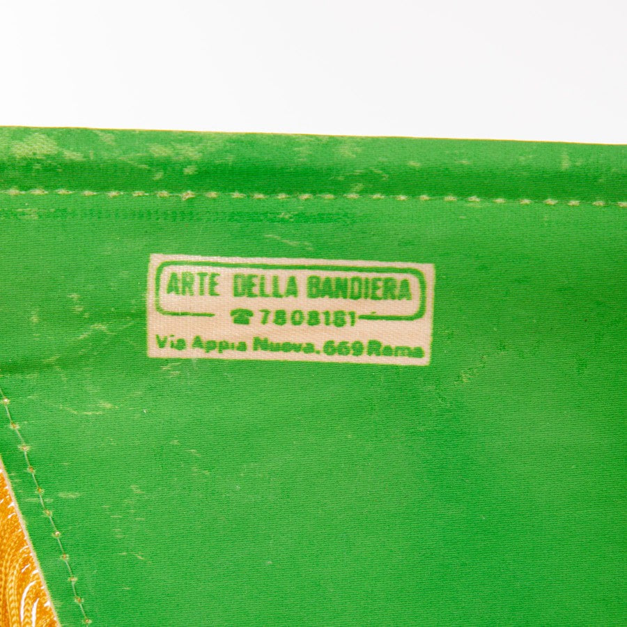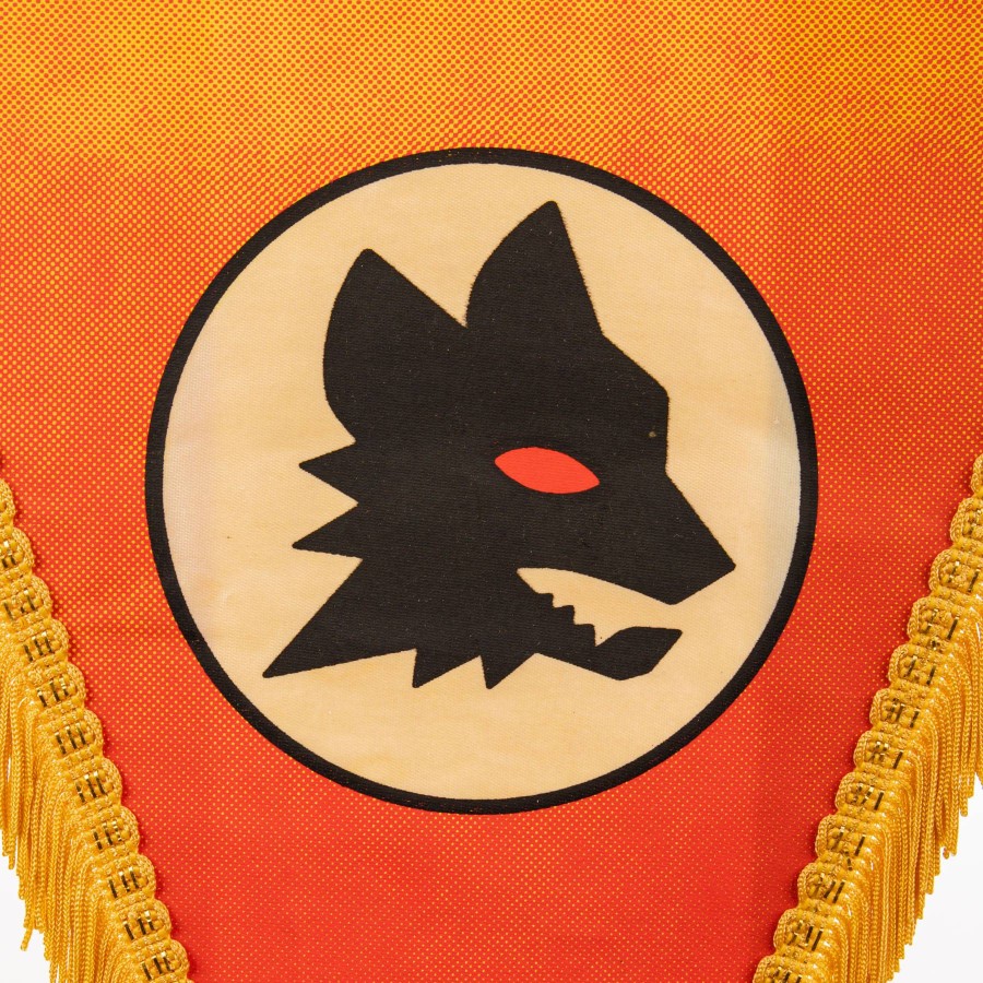 Gagliardetto della Roma con sfumature giallorosse che fanno da sfondo al simbolo della squadra calcistica, la testa della Lupa capitolina, nera con occhio rosso. Tricolore italiano sul retro.