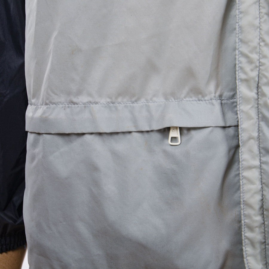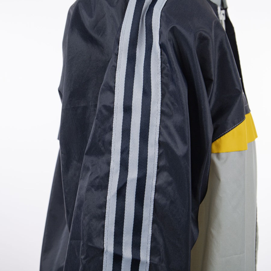 Modello giacca a vento dai colri blu e grigio con inserto giallo. Una striscia gialla orizzontale divide la giacca, la parte superiore del petto e le maniche sono blu, con girocollo e bande tradizionali Adidas di colore grigio. La parte inferiore è grigia ed ospita un tascone nella parte inferiore con cerniera orizzontale, la giacca è dotata ddella cerniera integrale frontale a scomparsa. Nella parte superiore lato cuore è applicato lo sponsor commerciale Canano, a sinistra il lettering della socità Hellas Verona. Sul dorso applicato lo sponsor Canon.