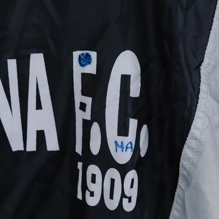 Giacca antivento ufficiale del Bologna FC per la stagione 2005/2006, realizzata dallo sponsor tecnico Macron. Di colore nero con dettagli grigi, presenta il logo Macron ricamato sulla parte posteriore e il marchio dello sponsor commerciale Euro Ponteggi ben visibile sia sul retro che sul petto. Sul davanti spicca il logo del Bologna FC 1909, impreziosendo questa giacca pensata per affrontare le condizioni meteorologiche avverse. Taglia XL, perfetta per collezionisti e appassionati rossoblù.