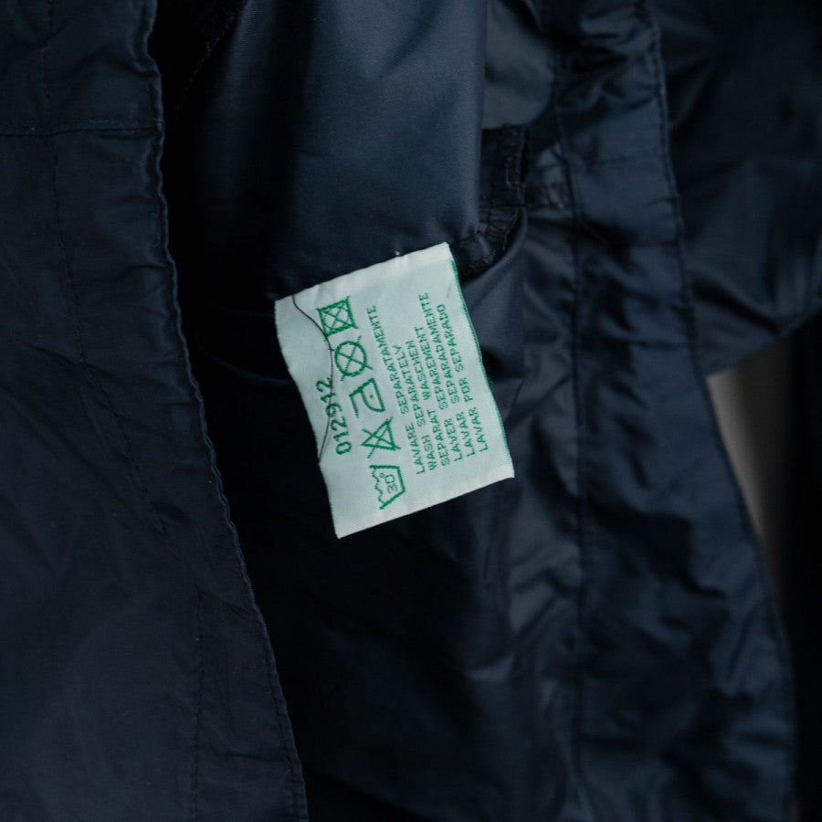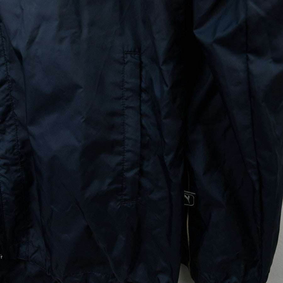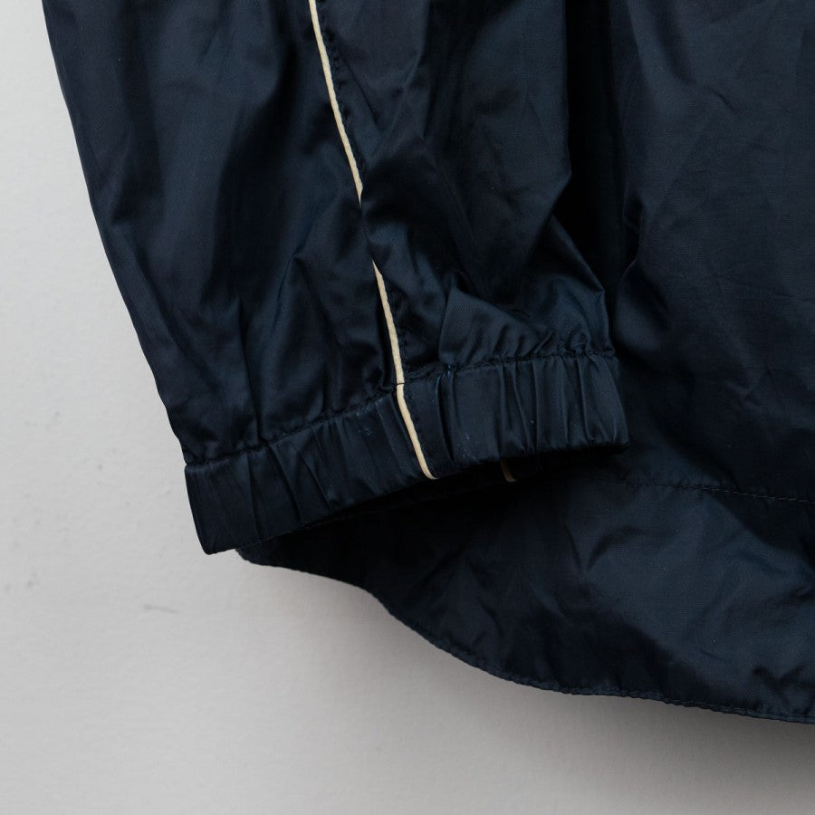 Giacca ufficiale antivento della SSC Napoli per la stagione 2000/2001, prodotta dallo sponsor tecnico Diadora. Il design, di colore blu scuro con dettagli bianchi, include il logo Diadora ricamato sul petto e sulle maniche, accompagnato dal logo SSC Napoli ricamato sul lato cuore. Sulla manica destra è presente il vecchio stemma circolare del Napoli. La giacca presenta una chiusura a zip integrale e polsini elasticizzati per una maggiore protezione contro il vento. Taglia M.