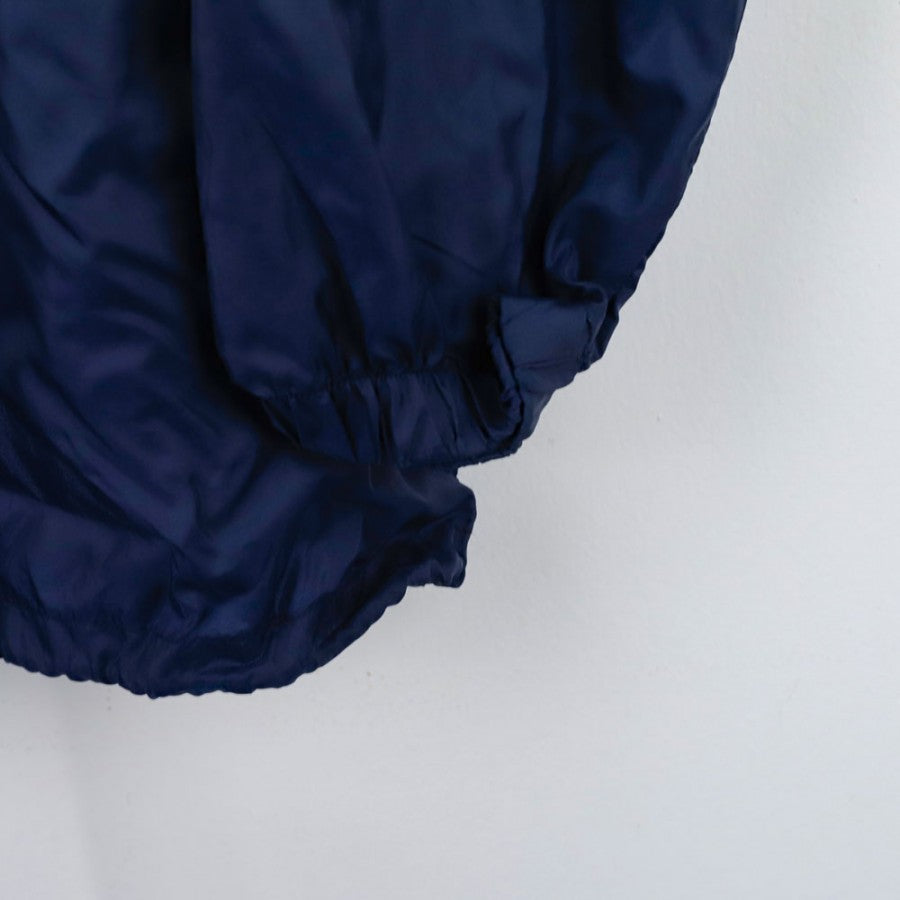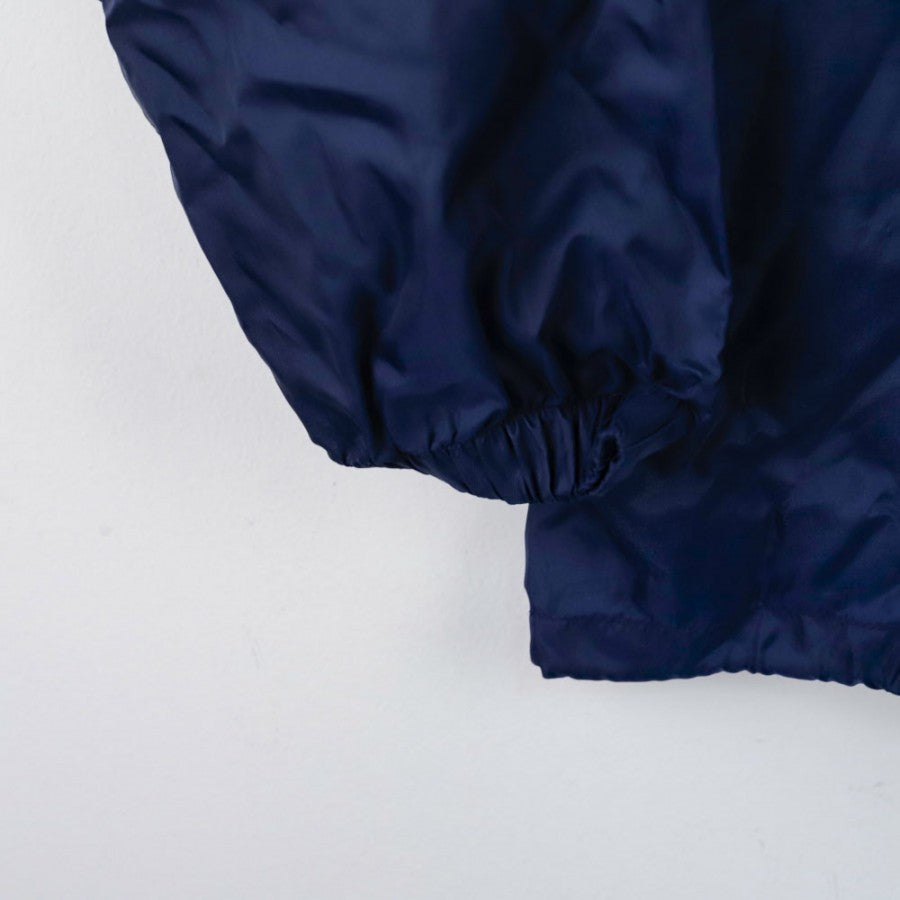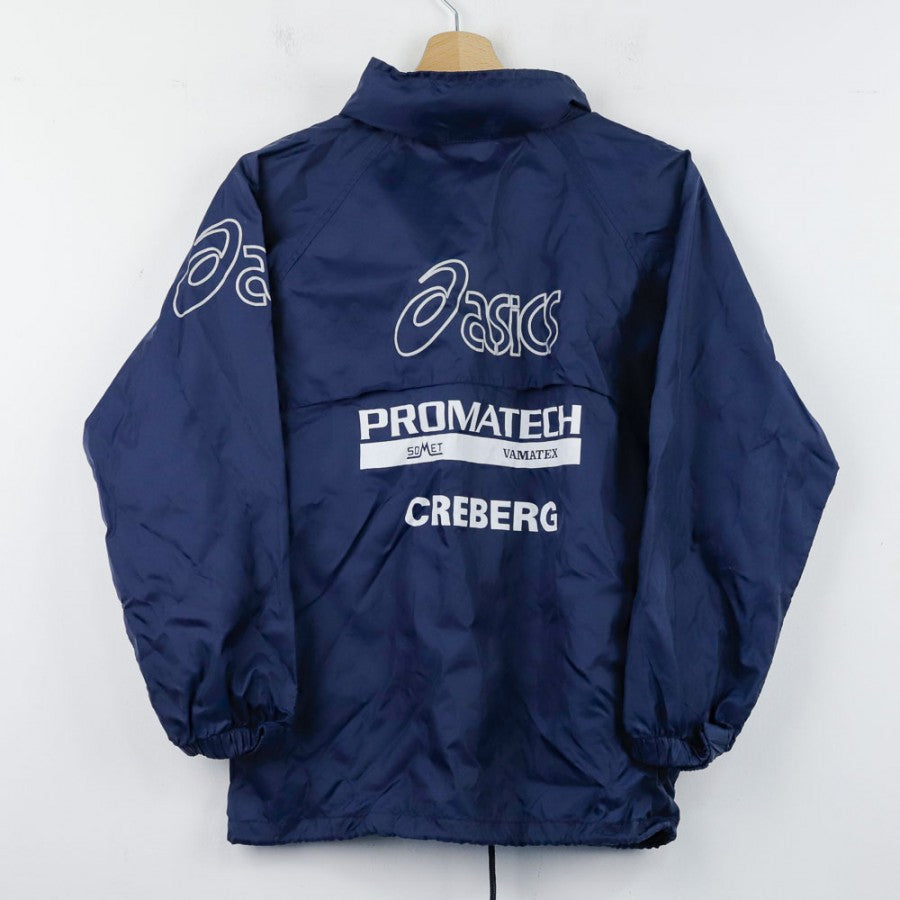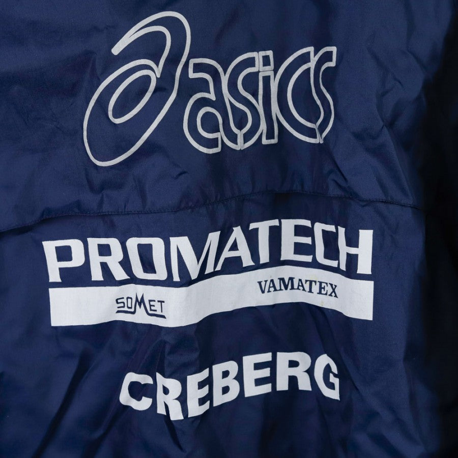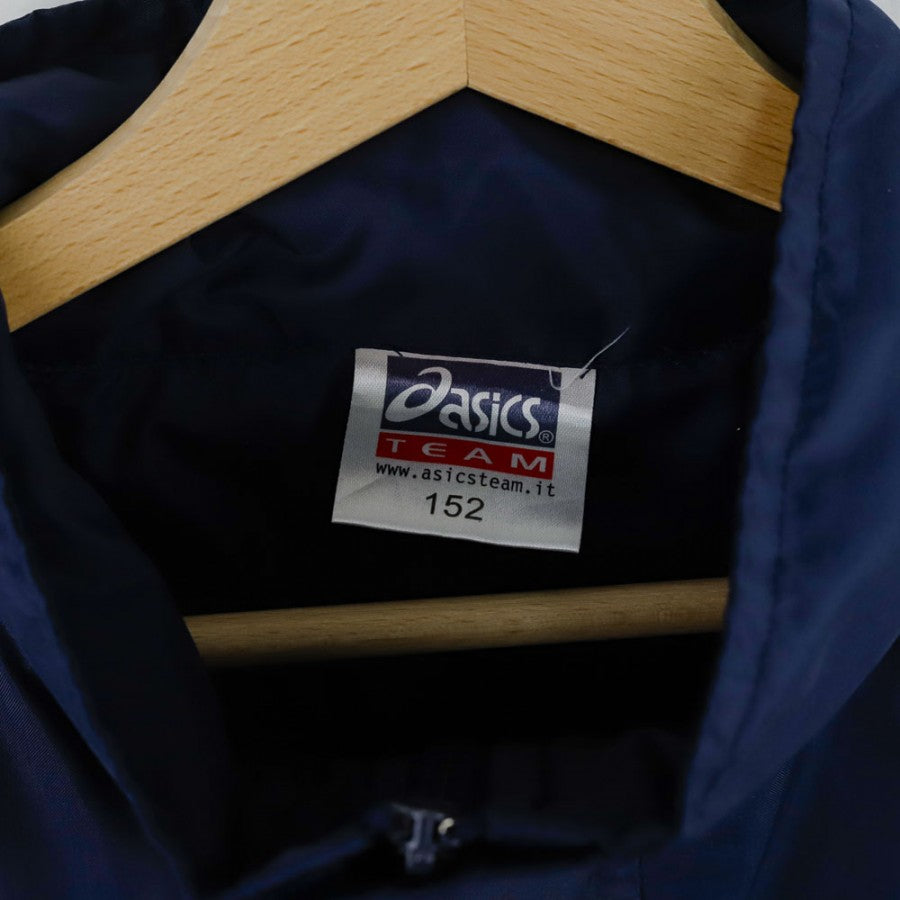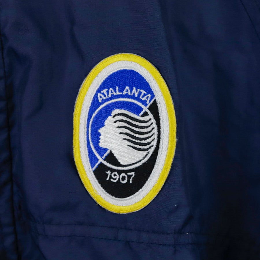 Giacca ufficiale da bambino dell'Atalanta per la stagione 2002/2003, prodotta dallo sponsor tecnico Asics. Di colore blu navy, presenta il logo Asics ricamato sul petto e sulle maniche, mentre lo stemma ufficiale dell'Atalanta è applicato sul lato cuore. Sul retro, spiccano gli sponsor commerciali Promatech, Somet, Vamatex e Creberg in bianco. Il modello è dotato di chiusura a zip con copertura in velcro e polsini elasticizzati, garantendo un'ottima vestibilità e protezione dal vento.