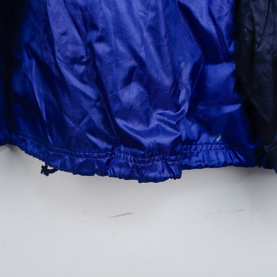 Giacca ufficiale del Barcellona per la stagione 1996/1997, realizzata dallo sponsor tecnico Kappa. Di colore blu con dettagli navy e inserti bianchi, la giacca è caratterizzata dal logo Kappa ripetuto sulle maniche e dalla scritta "Barcelona" applicata in rosso sulle spalle. Sul petto, lato cuore, è presente il logo Kappa cucito, mentre la parte posteriore mostra il logo Kappa al centro. I dettagli in rosso e bianco lungo le maniche e i bordi completano il design. La giacca, in taglia XL, è un simbolo dello stile iconico degli anni '90, perfetta per collezionisti e tifosi blaugrana.