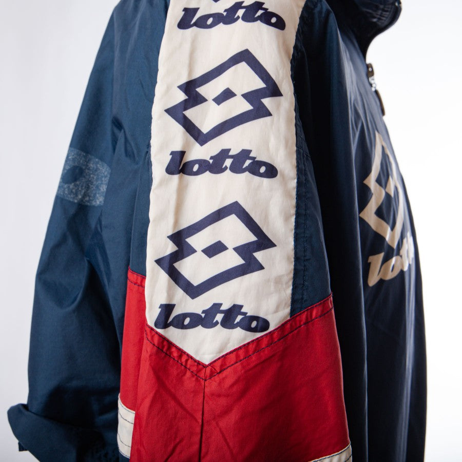 La giacca del Bari è prodotta da Lotto in colore blu con dettagli bianchi e rossi. Chiusura full zip e cappuccio a scomparsa nel collo. Laccetto regolabile in vita e comode tasche con zip. Patch del Bari cucita e logo dello sponsor tecnico Lotto applicato.