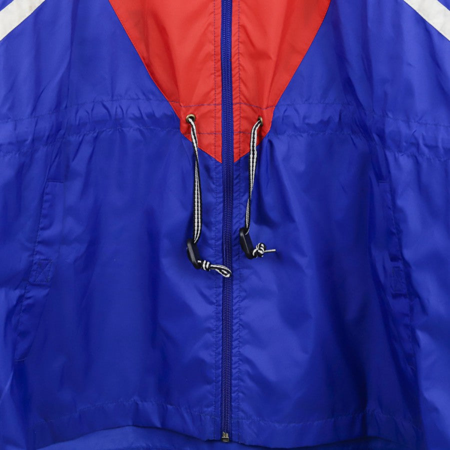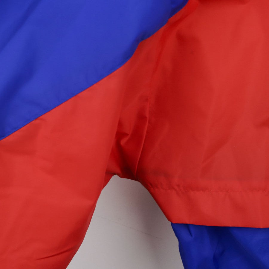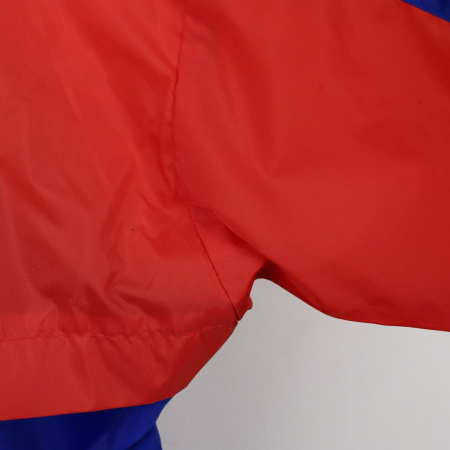 Giacca ufficiale del Bayern Monaco per la stagione 1993/1994, prodotta dallo sponsor tecnico Adidas. Il capo presenta una colorazione vivace con inserti rosso e blu, in perfetto stile anni '90. Sul petto sinistro è cucito lo stemma del club, mentre sul lato destro troviamo il logo Adidas ricamato in bianco. Le iconiche tre strisce Adidas sono posizionate obliquamente ai lati del busto. Il retro è dominato dalla grande scritta “adidas” in bianco. La giacca è dotata di zip integrale, coulisse regolabile in vita e polsini elasticizzati. La taglia indicata è XL.