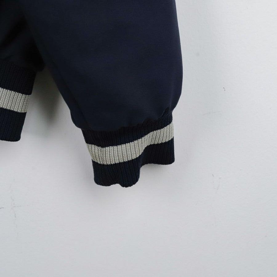 Giacca ufficiale del Bologna, stagione 2001/2002, prodotta dallo sponsor tecnico Macron. Di colore blu scuro, presenta lo stemma del club ricamato sul lato cuore e il logo Macron sul lato destro del petto. La giacca è dotata di zip centrale, polsini e fondo elasticizzati con righe bianche e grigie, offrendo comfort e protezione dal freddo. Ideale per i tifosi del Bologna, questa giacca rappresenta lo stile classico del club negli anni 2000. La taglia di questo modello è XL.