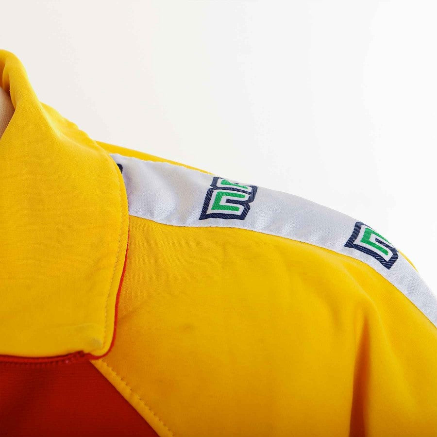 Giacca del Catanzaro full zip rossa e gialla stagione 1991/1992. Logo NR cucito lato cuore e sulle maniche. Lettering US Catanzaro applicato lato destro sul petto, logo sponsor commerciale S.I.A.R.C. applicato sul retro e sul lato cuore.