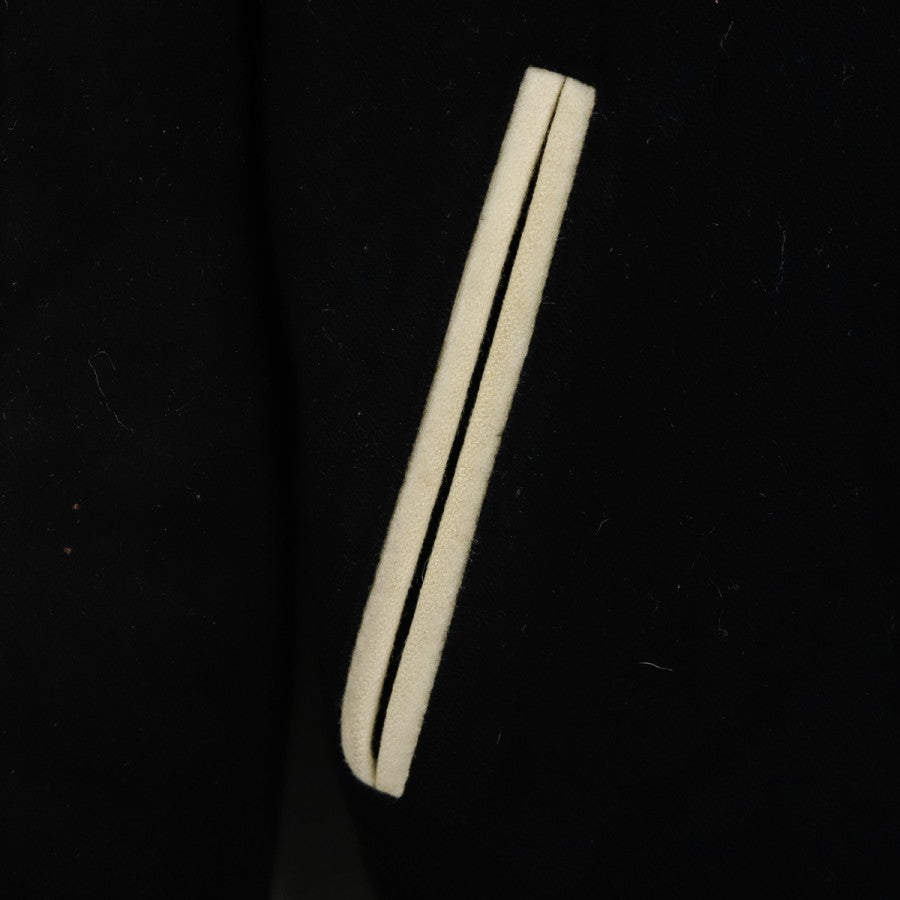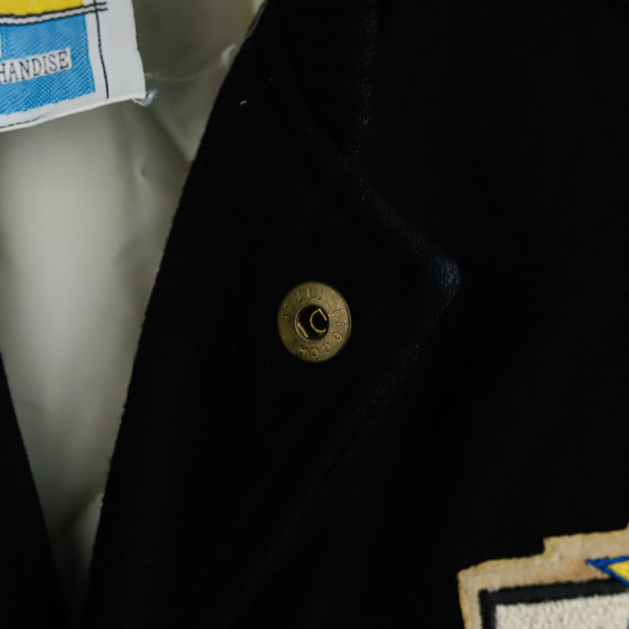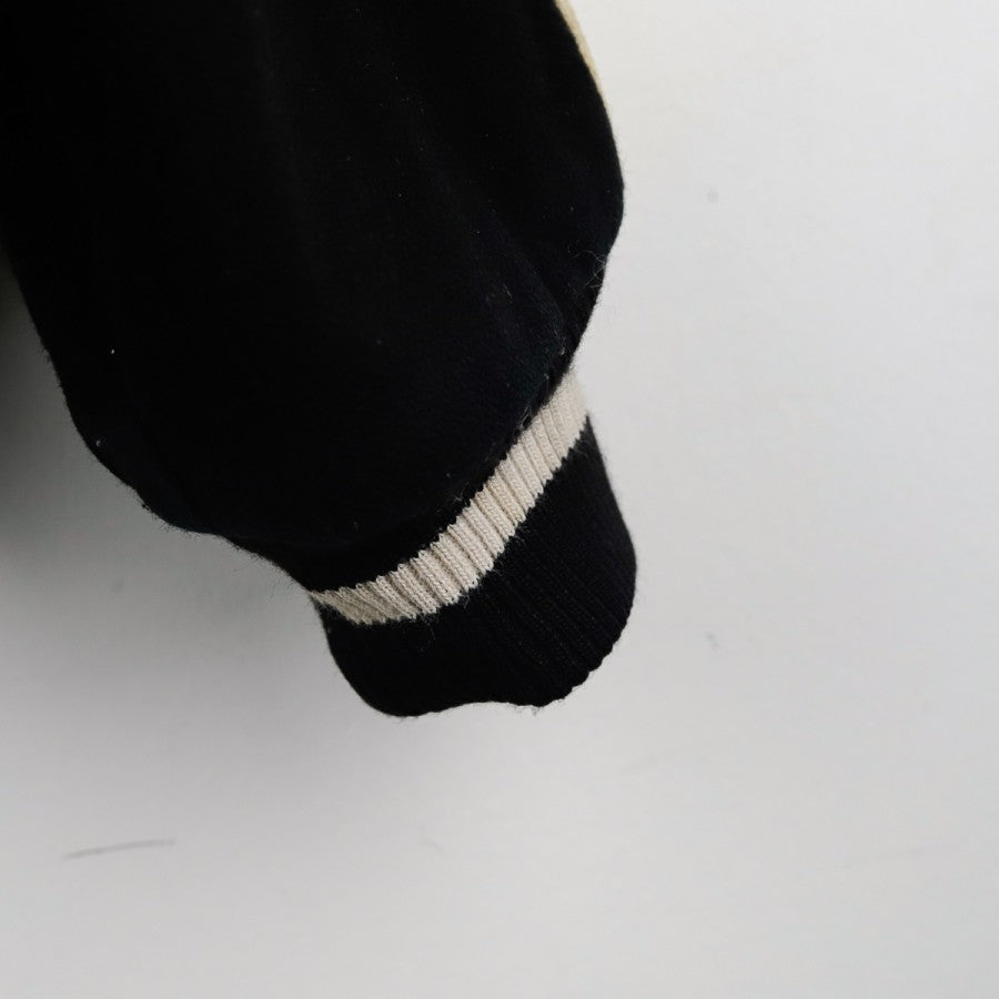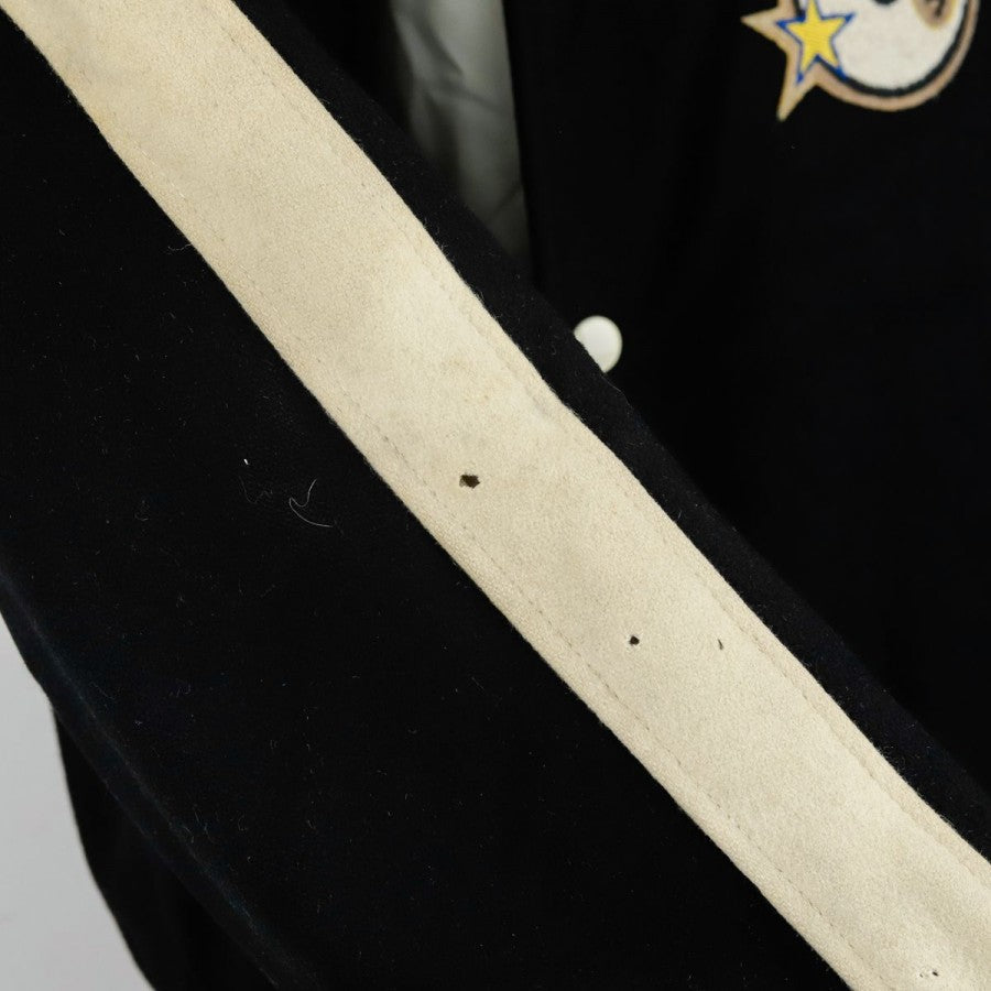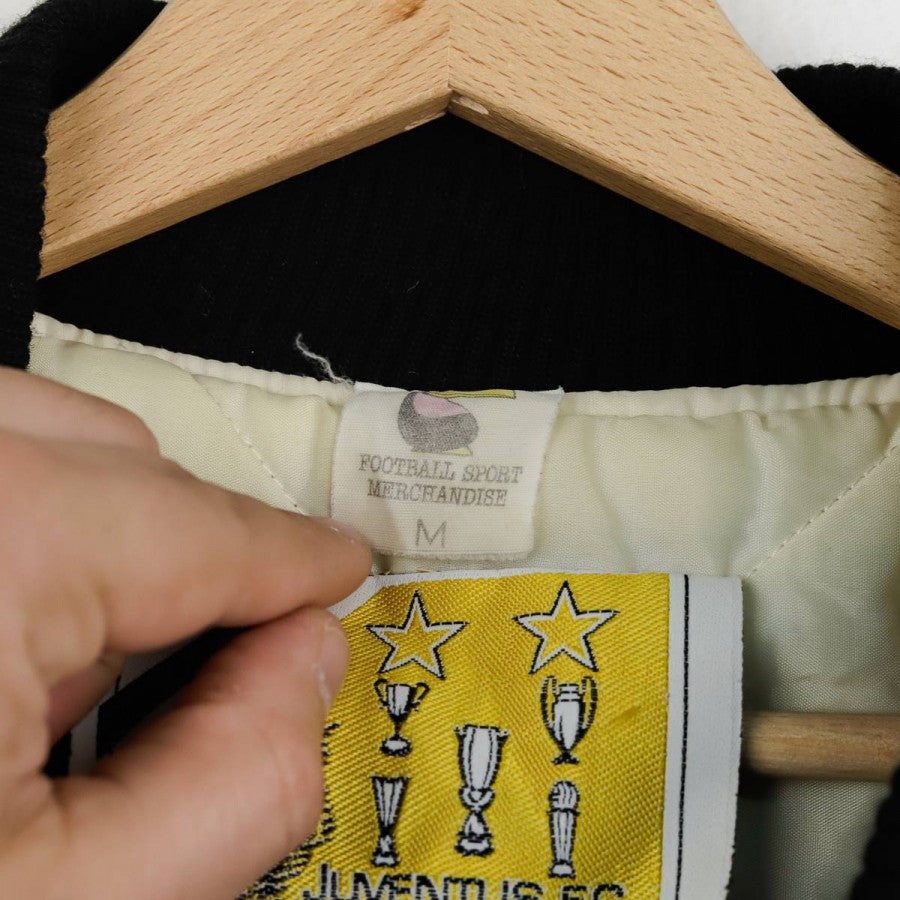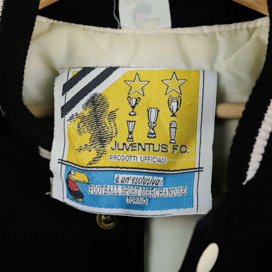 Giacca college ufficiale della Juventus, anni '80, prodotta da Kappa. Di colore nero con bande bianche sulle maniche, presenta il logo Juventus F.C. con una grande J e due stelle ricamate sul petto. L'etichetta interna mostra i trofei vinti dalla squadra fino a quel momento. Taglia M. Un capo storico per i veri tifosi bianconeri.