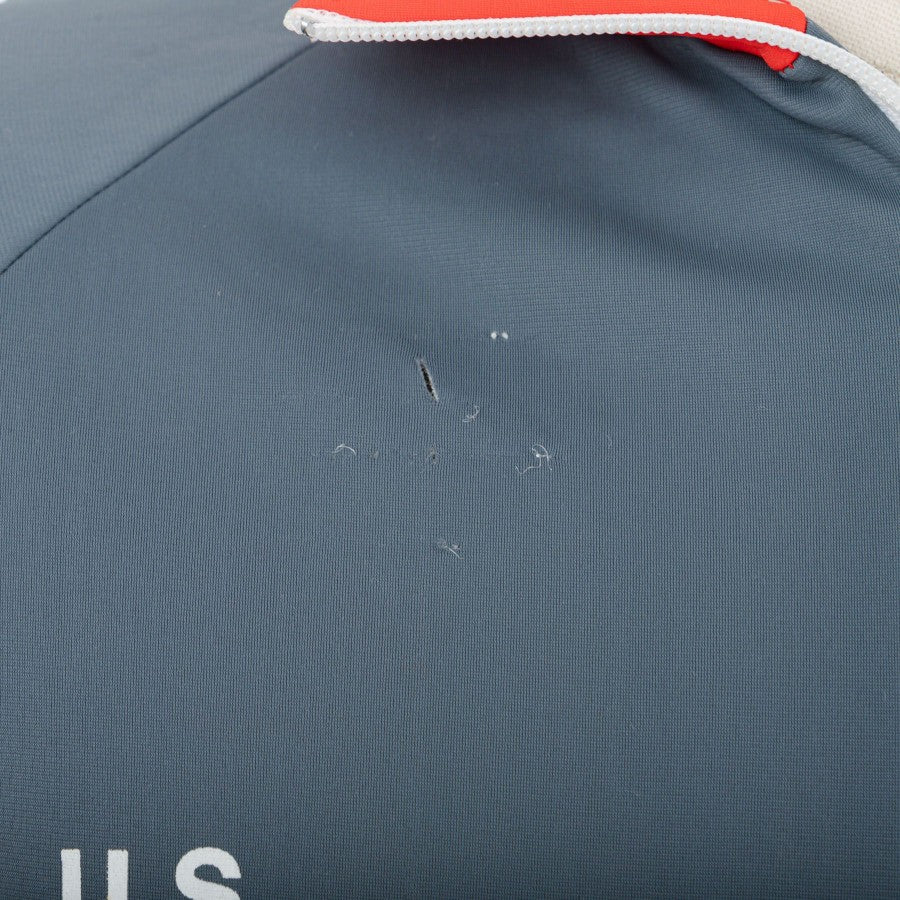 Il prodotto è ben visibile dalle varie foto. La giacca è a maniche lunghe, ha una lunga cerniera al centro, due tasche verso i fianchi e i suoi colori principali sono il rosso della sezione inferiore e il grigio di quella superiore per quanto riguarda il fronte e buona parte delle maniche, mentre sul retro prevale nettamente il grigio; in alto a sinistra è applicato lo sponsor commerciale, MAJESTIC, mentre dalla parte opposta troviamo la dicitura "u.s. cremonese", entrambi in colore bianco.
