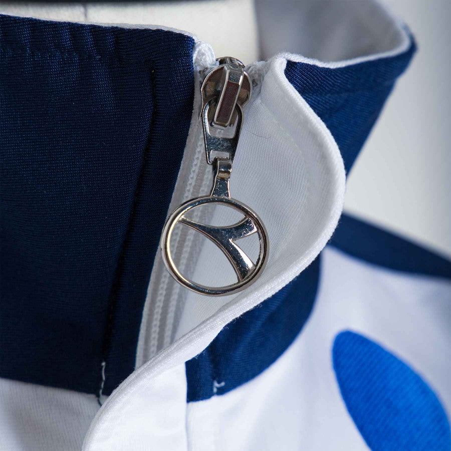 Giacca nazionale italiana in condizioni perfette, ornata di stampe geometriche con fondo blu e particolari in tricolore, abbottonatura funzionante e toppe in regola, fondo del capo e maniche con arricciatura elastica, sponsor tecnico Diadora. All'interno del collo è cucita la lettering DIADORA.