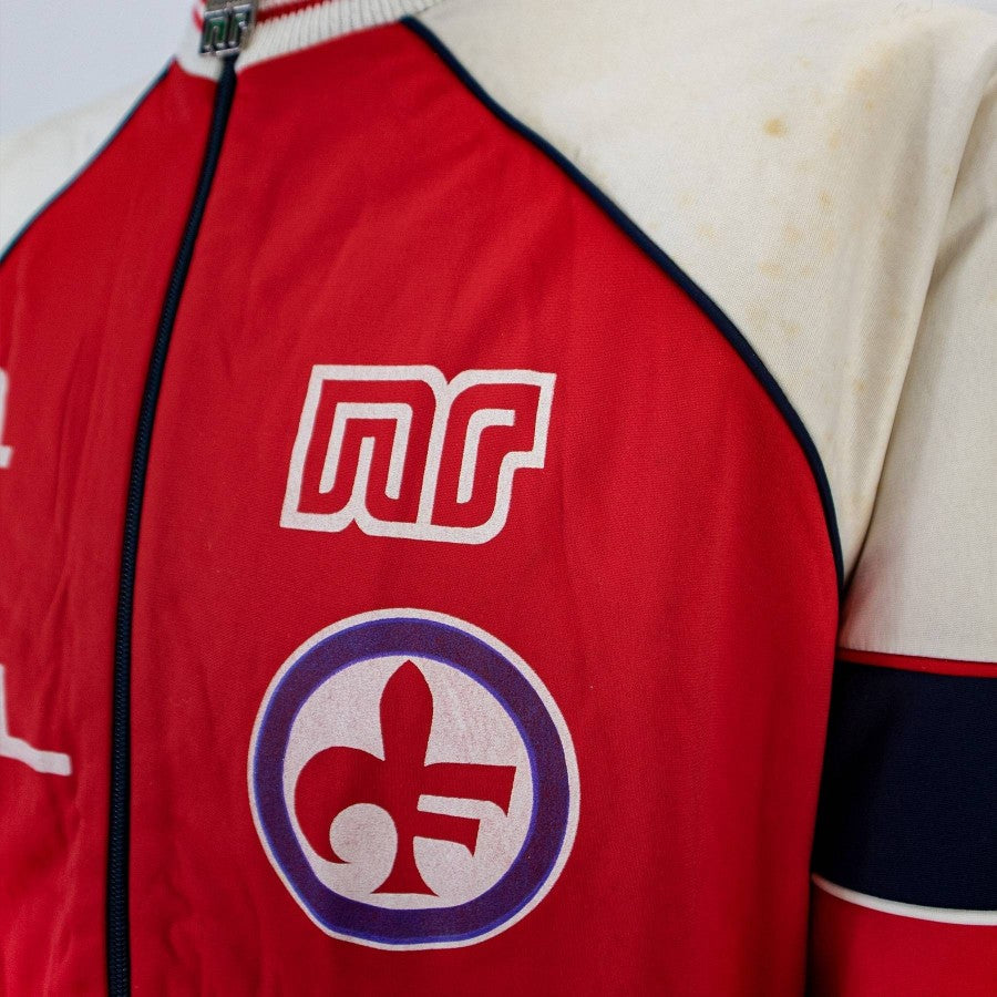 Giacca della Fiorentina anni '80 in dotazione alla squadra viola, realizzato dallo sponsor tecnico Ennerre. Il capo è in condizioni buone a meno della parte di colore bianco che è ingiallita in alcuni punti per via del precedente stato di conservazione. Le applicazioni verniciate di sponsor e loghi sono in eccellente stato di conservazione.