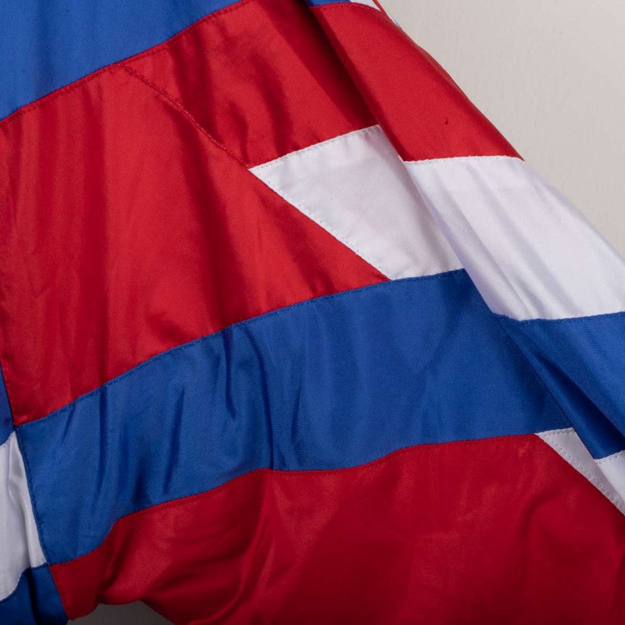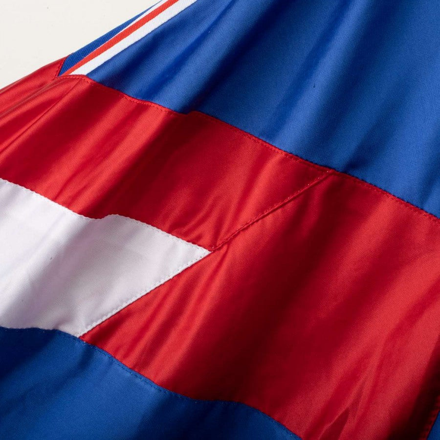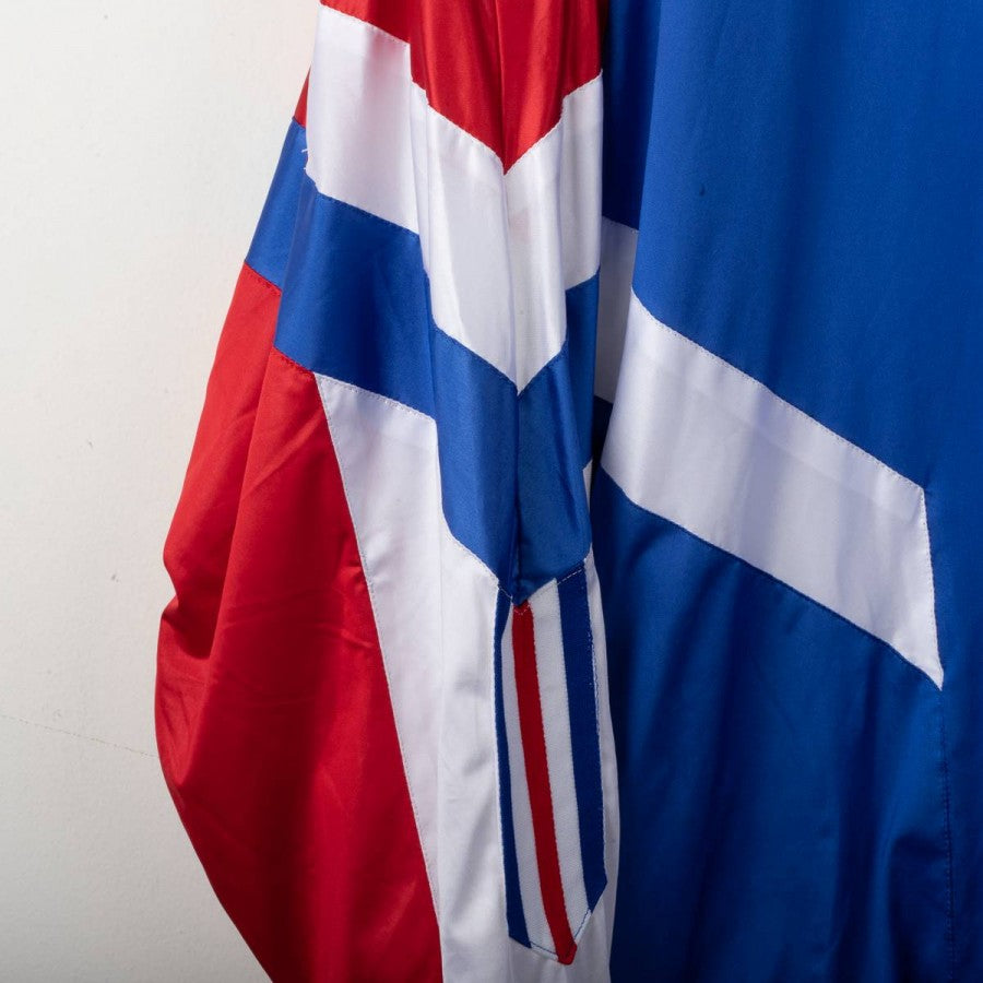 Giacca rappresentanza della nazionale francese utilizzata tra il 1990 e il 1992, prodotta da Adidas. Colore blu con dettagli rossi e bianchi, iconiche tre strisce Adidas sulle maniche. Logo Adidas ricamato in bianco sul petto destro, stemma F.F.F. cucito lato cuore. Chiusura con zip intera frontale, polsini e fondo elasticizzati per una migliore vestibilità. Taglia D6.