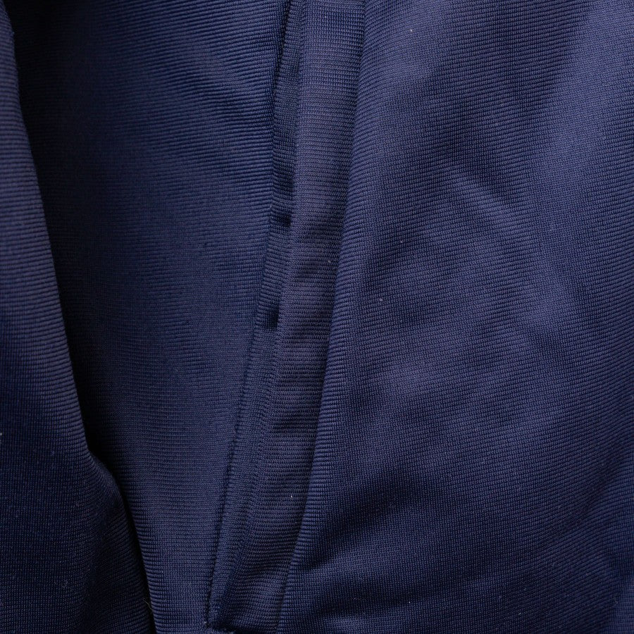 La giacca del Genoa è di colore blu con inserti rossi e bianchi e si presenta con una zip completa. Sul lato cuore è cucito lo stemma del club, mentre sul lato destro troviamo il logo dello sponsor tecnico Errea con le bande ai lati della casacca.