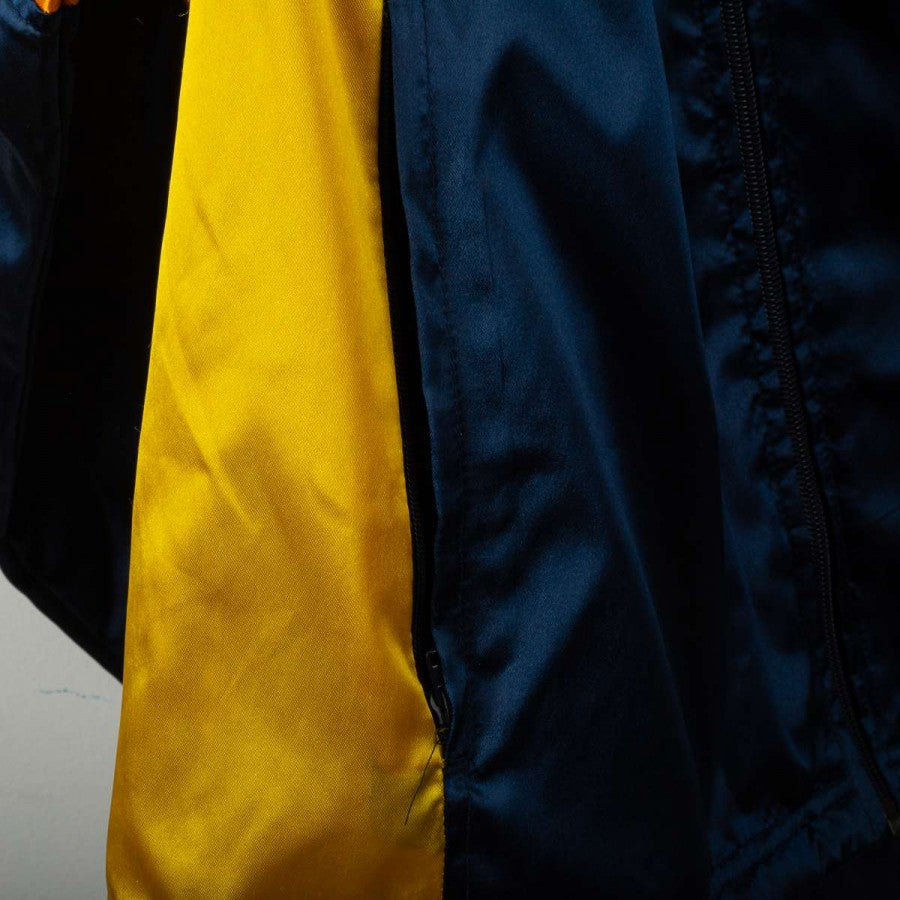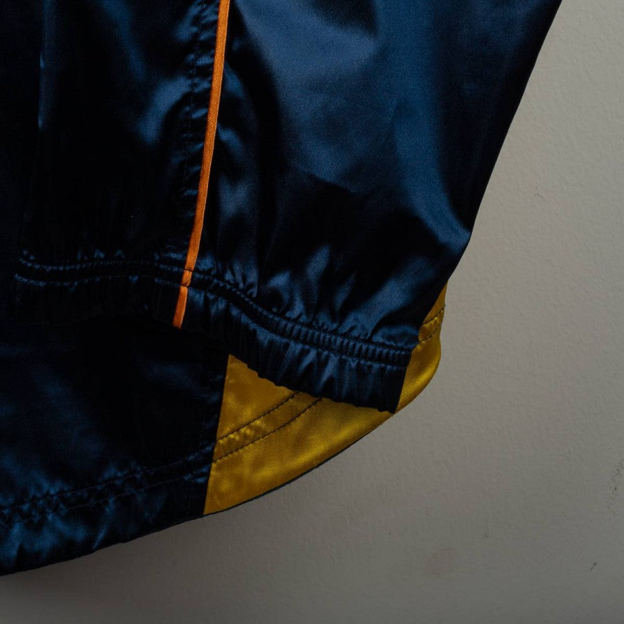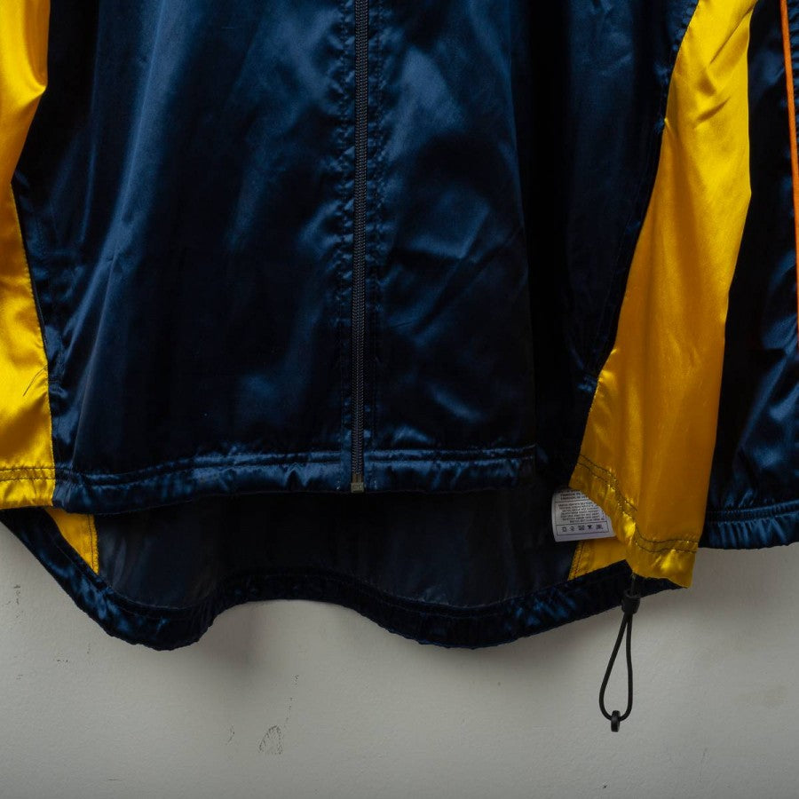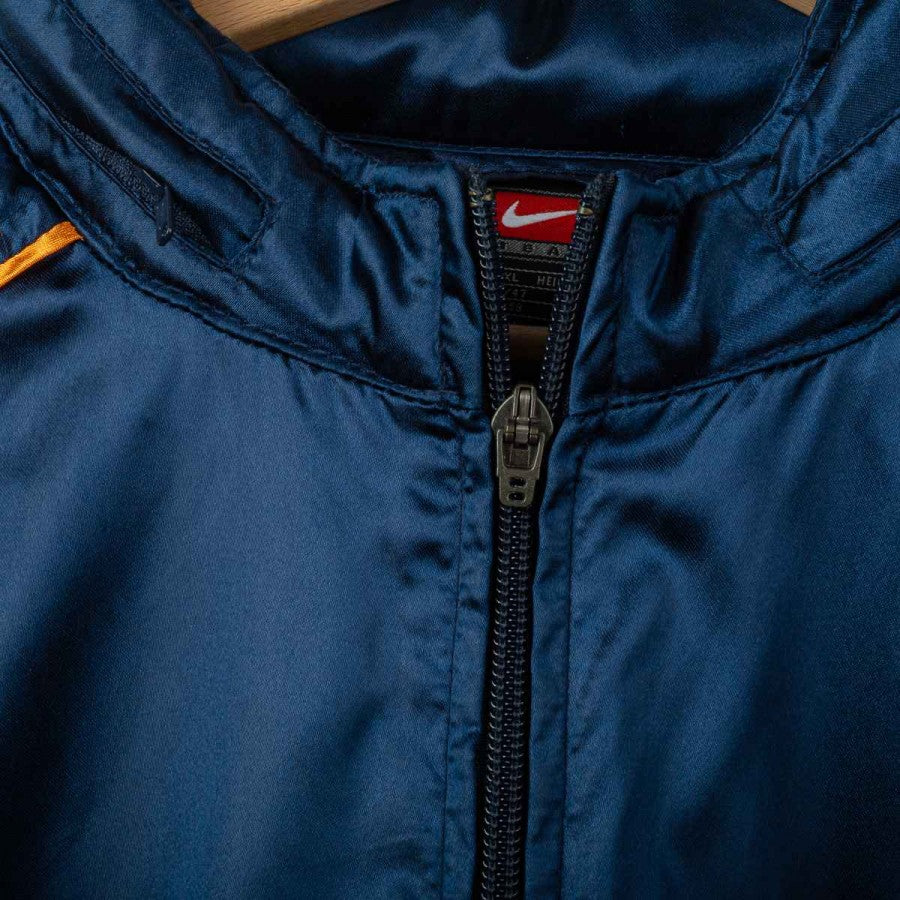 Giacca dell'Inter indossata durante la stagione 2001/2002, prodotta da Nike. Colore blu navy con dettagli arancioni e inserti gialli sulle maniche. Logo Nike ricamato e stemma Inter applicato lato cuore, con la data di fondazione “1908”. Sul retro, iconico logo Nike cucito all'altezza del collo. Presente anche il simbolo del Biscione, storico emblema del club, stampato sulla manica destra. Vestibilità ampia. Taglia XL.