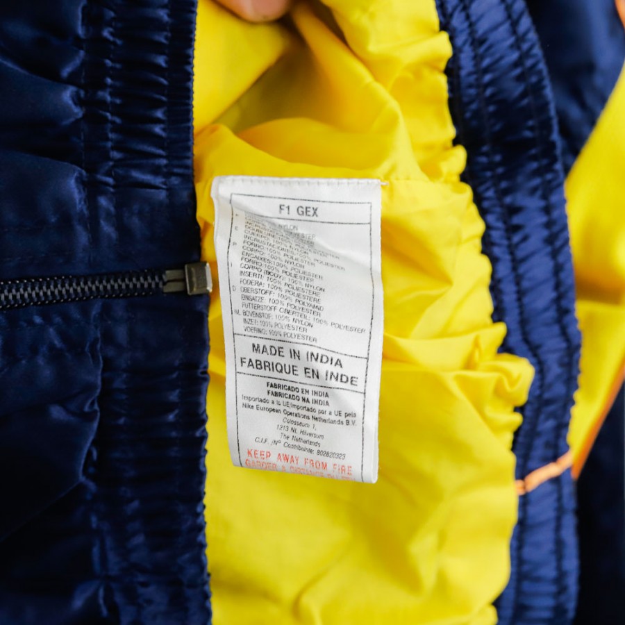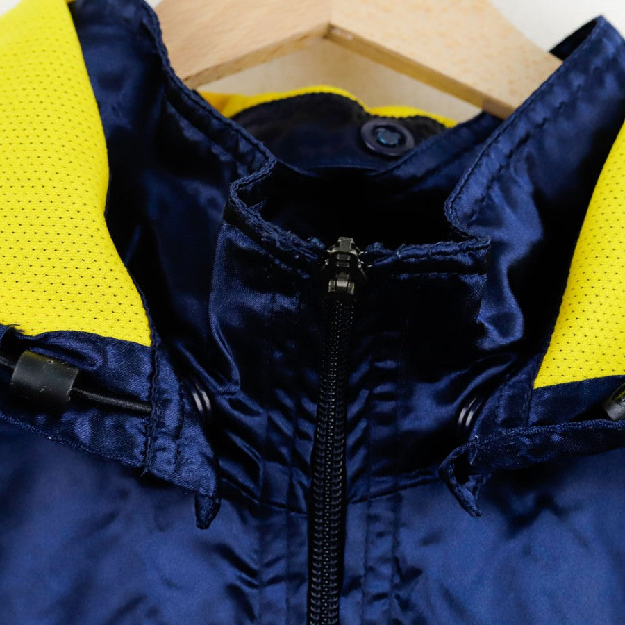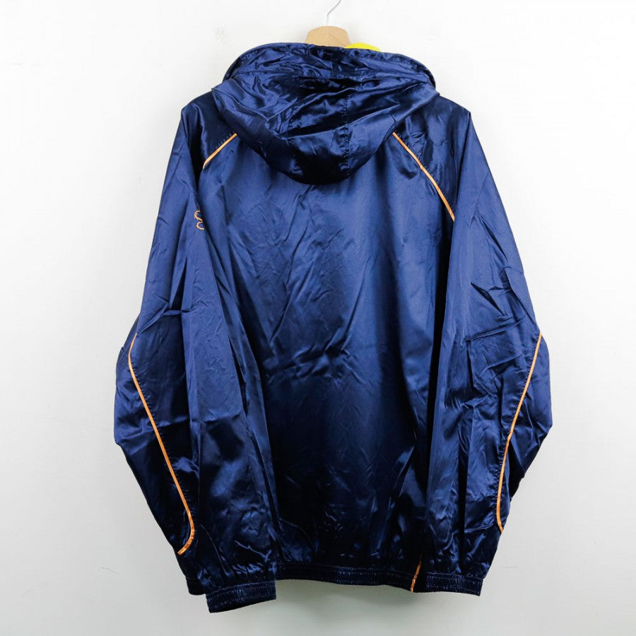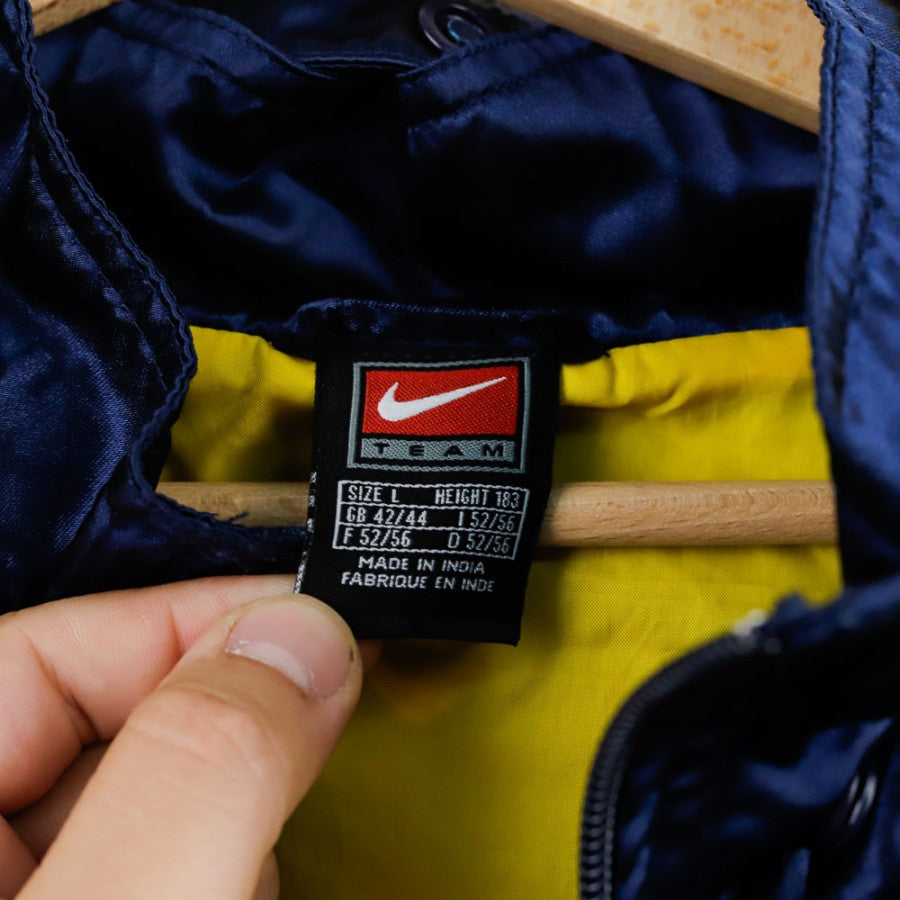 Giacca ufficiale dell'Inter per la stagione 2001/2002, realizzata da Nike. Il logo tecnico è presente sul petto, accanto allo stemma del club nerazzurro. Modello in tessuto lucido blu notte con dettagli gialli a contrasto, cappuccio integrato e chiusura a zip frontale. Sulle maniche compaiono finiture arancioni e la scritta “Internazionale” sul fianco. Taglia L riportata sull'etichetta interna.