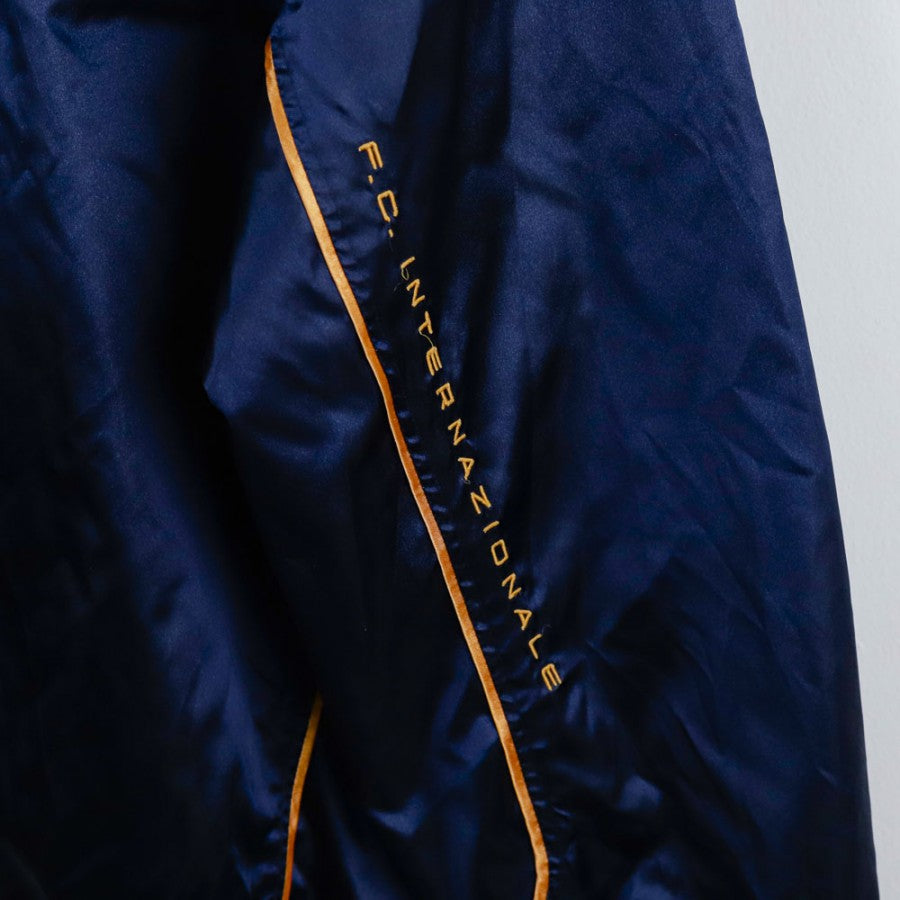 Questa giacca classica dell'Inter della stagione 2001/2002, realizzata da Nike, presenta una base blu scuro con accenti vivaci gialli, inclusi i bordi lungo le maniche e i lati. Sul petto spicca l'iconico stemma dell'Inter insieme al logo Nike in giallo, offrendo un contrasto elegante. La giacca è dotata di un cappuccio con fodera gialla, unendo funzionalità a un design deciso. In questa stagione, l'Inter lottò duramente in Serie A, raggiungendo il terzo posto finale.