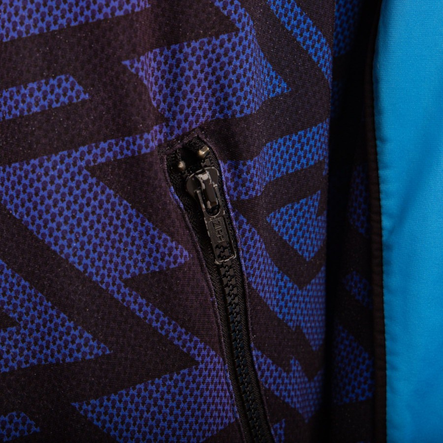 Il prodotto è ben visibile dalle foto che lo riguardano. La giacca è a maniche lunghe e si può aprire o chiudere tramite una cerniera posta al centro; i colori principali che la caratterizzano sono l'azzurro, che è presente in gran parte delle maniche, e soprattutto il blu scuro al cui interno stanno delle forme geometriche di colore nero che richiamano il logo della Umbro, lo sponsor tecnico; in alto a sinistra è ricamato il logo del club nerazzurro, mentre sul lato opposto a essere ricamati sono il logo della Umbro e la sua denominazione in basso, entrambi dorati; i bordi delle maniche e della giacca sono concepiti entrambi con il colore nero.